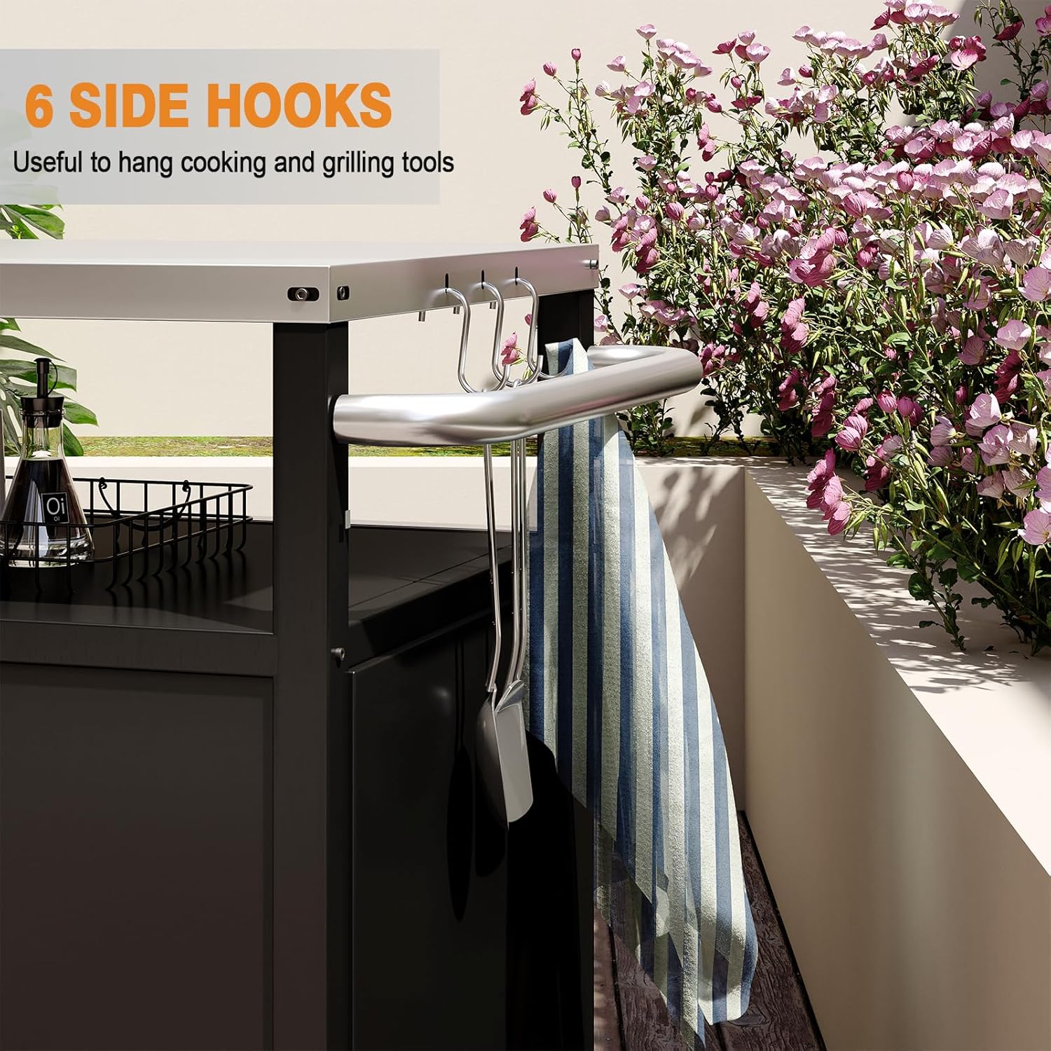 • Outdoor Grilling Equipment Addition Equipped with 2 wheels and a handle, this cart is highly convenient for outdoor grilling. You can easily wheel it inside for food preparation and then move everything outside for cooking, making the entire process much simpler. The table can be used for BBQing, grilling, and even as a pizza oven stand table. The six hooks provided are very useful for hanging cooking and grilling tools, ensuring they are always within arm's reach when needed.