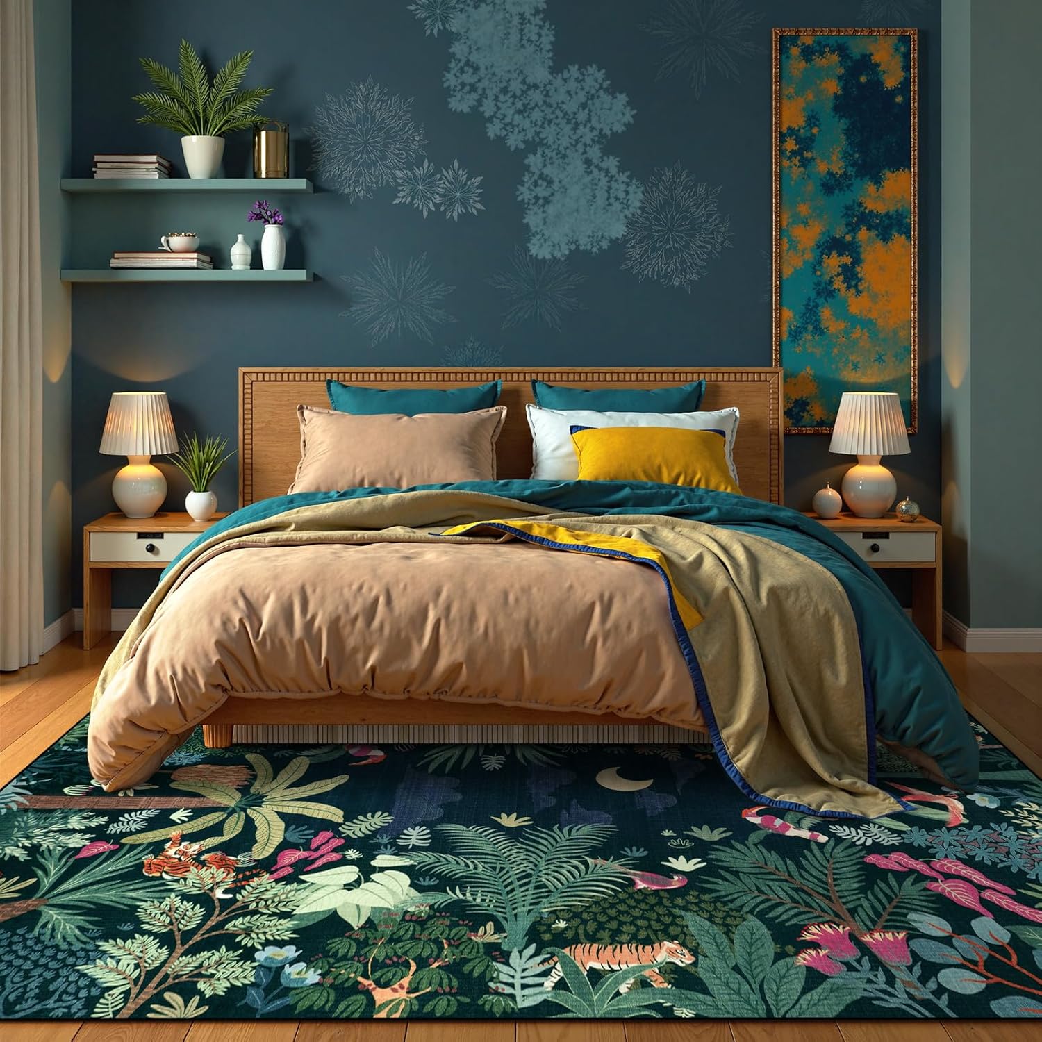 • 【Day and Night Collection】: LIVEBOX Day and Night Collection Rug captures the sky's transformation from dawn to midnight. With vibrant hues of four color, this rug brings the jungle's enchanting beauty and the sky's magical shifts into your space.