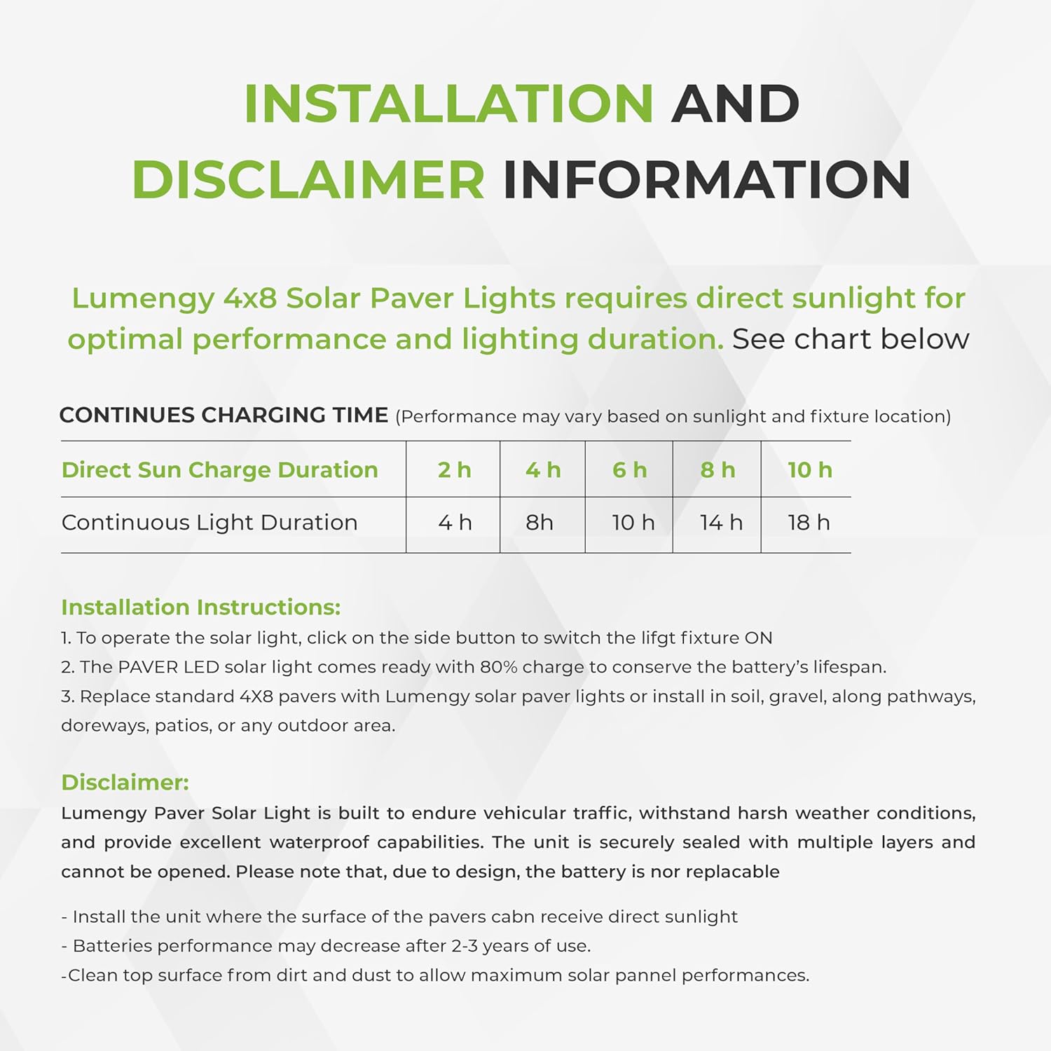 • Package Included – One 4×8 solar-powered paver light and an installation manual.