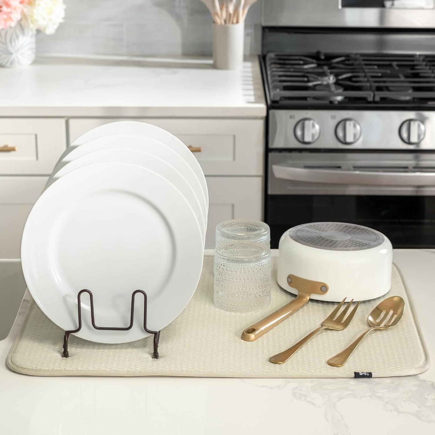 • Dish drying mats for kitchen counter are reusable, machine washable, and easy to store for kitchen organization; durable construction will not chip or break like a stone dish drying mat for kitchen