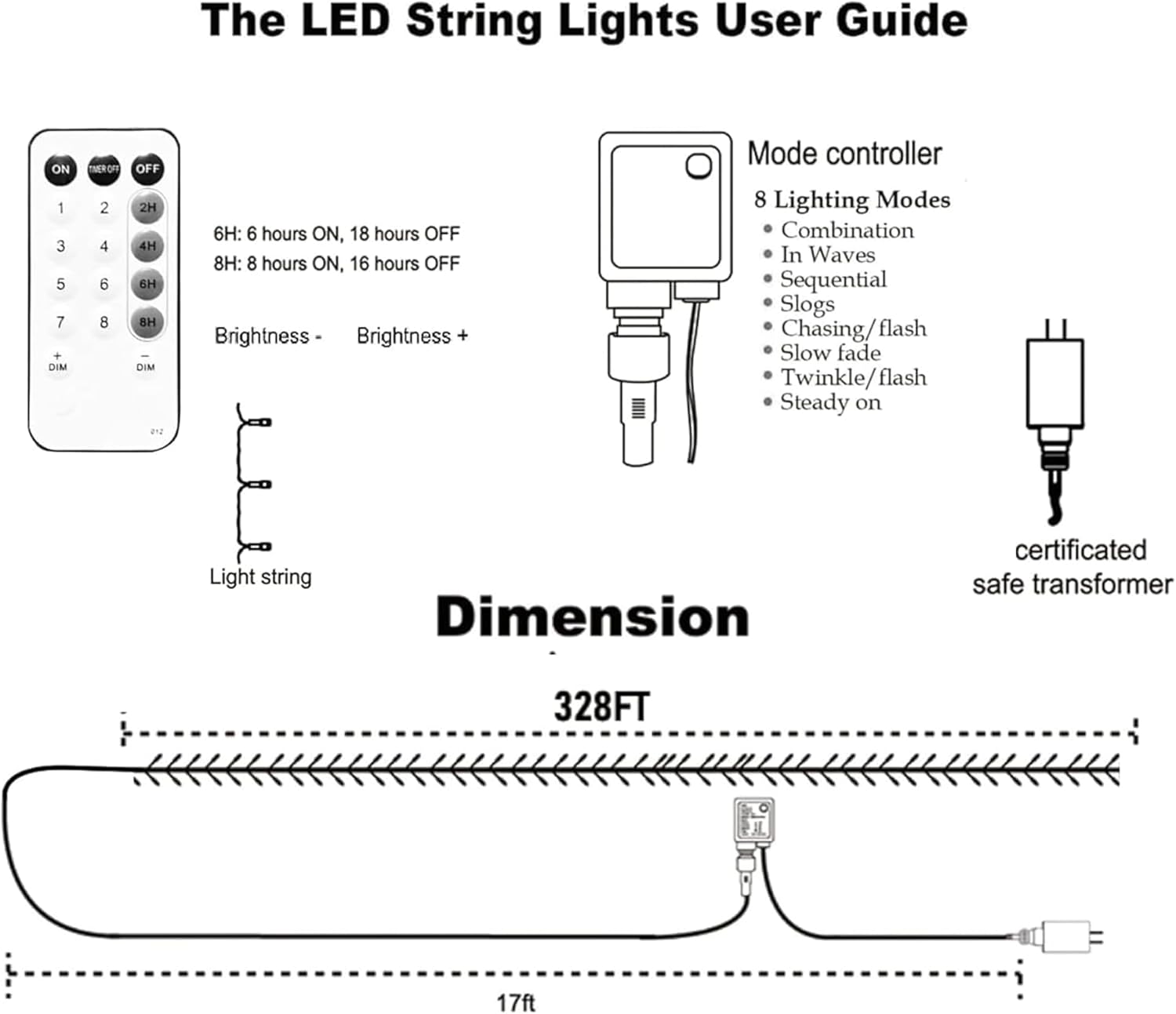• Remote Control: The Halloween string lights can be controlled with wireless remote, you can set different modes, timer, brightness, etc. There are 8 lighting modes (combination, in waves, sequential, slo-glo, chasing/flash, slow fade, twinkle/flash, steady on). It also has 4 timer modes, "2H" (2 hours on/22 hours off), "4H" (4 hours on/20 hours off), "6H" (6 hours on/18 hours off), "8H" (8 hours on/16 hours off)