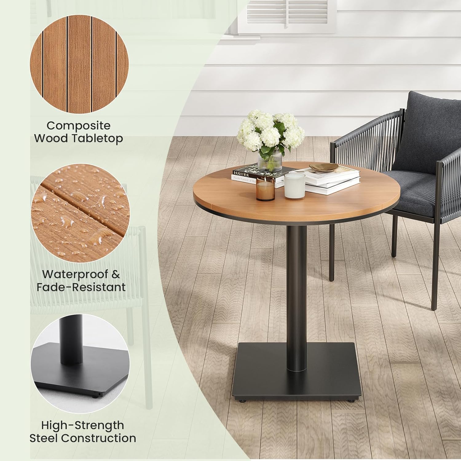 • [PLASTIC-WOOD TABLE]: This outdoor table is made from a unique wood-like tabletop and a heavy metal base for support. The plastic-wood table makes it more suitable for outdoor use, resistant to rust, dirt, and easy to care for.