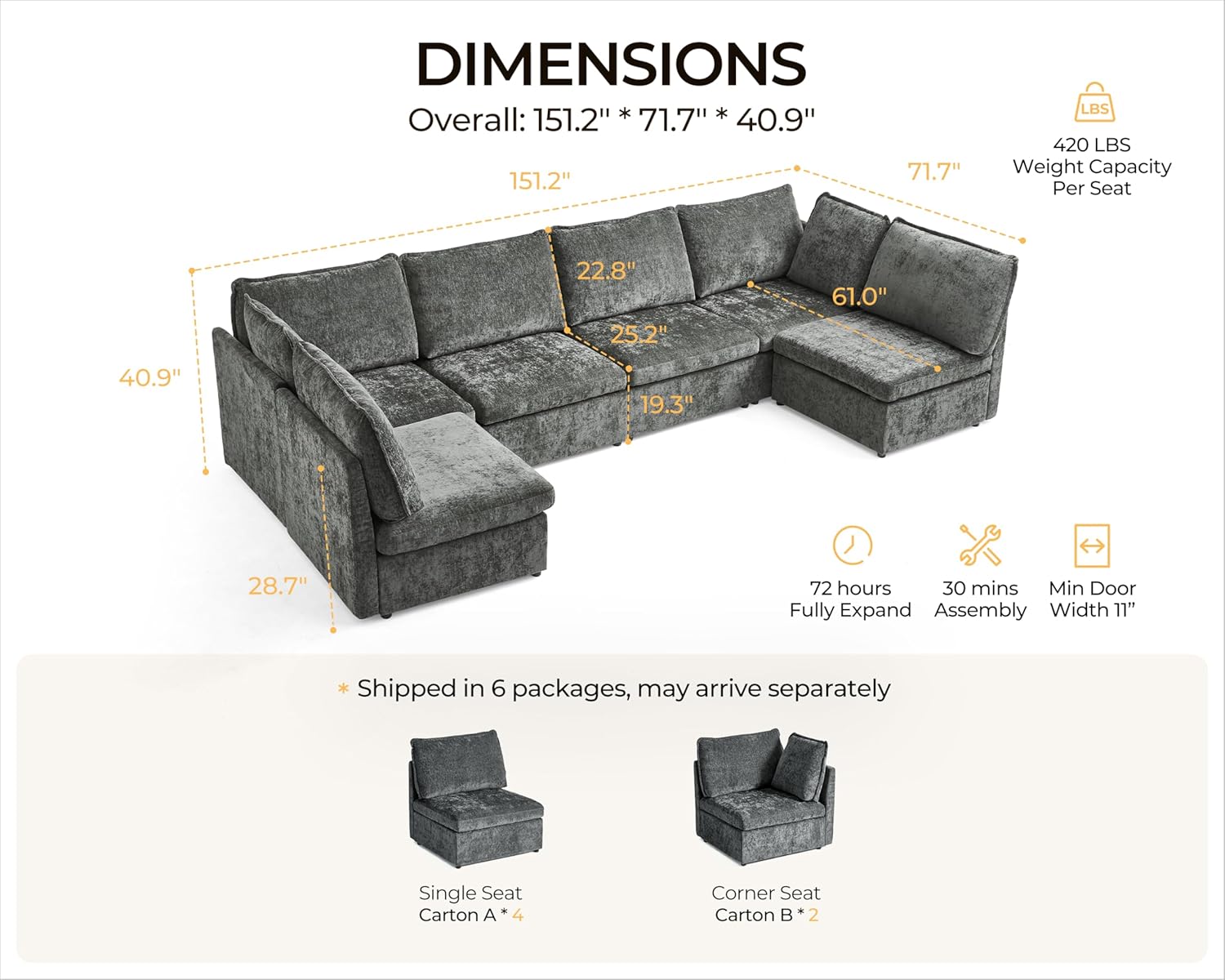 • 【Multiple Packages & Dedicated Support】 Your cloud modular sectional couch ships in 6 separate packages, which may arrive at different times. If you receive only some boxes, don’t worry—more are on the way! Need additional tracking details or assistance? We’re happy to help—just reach out! Our team is here to ensure you receive everything as expected and guarantee a smooth, hassle-free shopping experience with your complete satisfaction