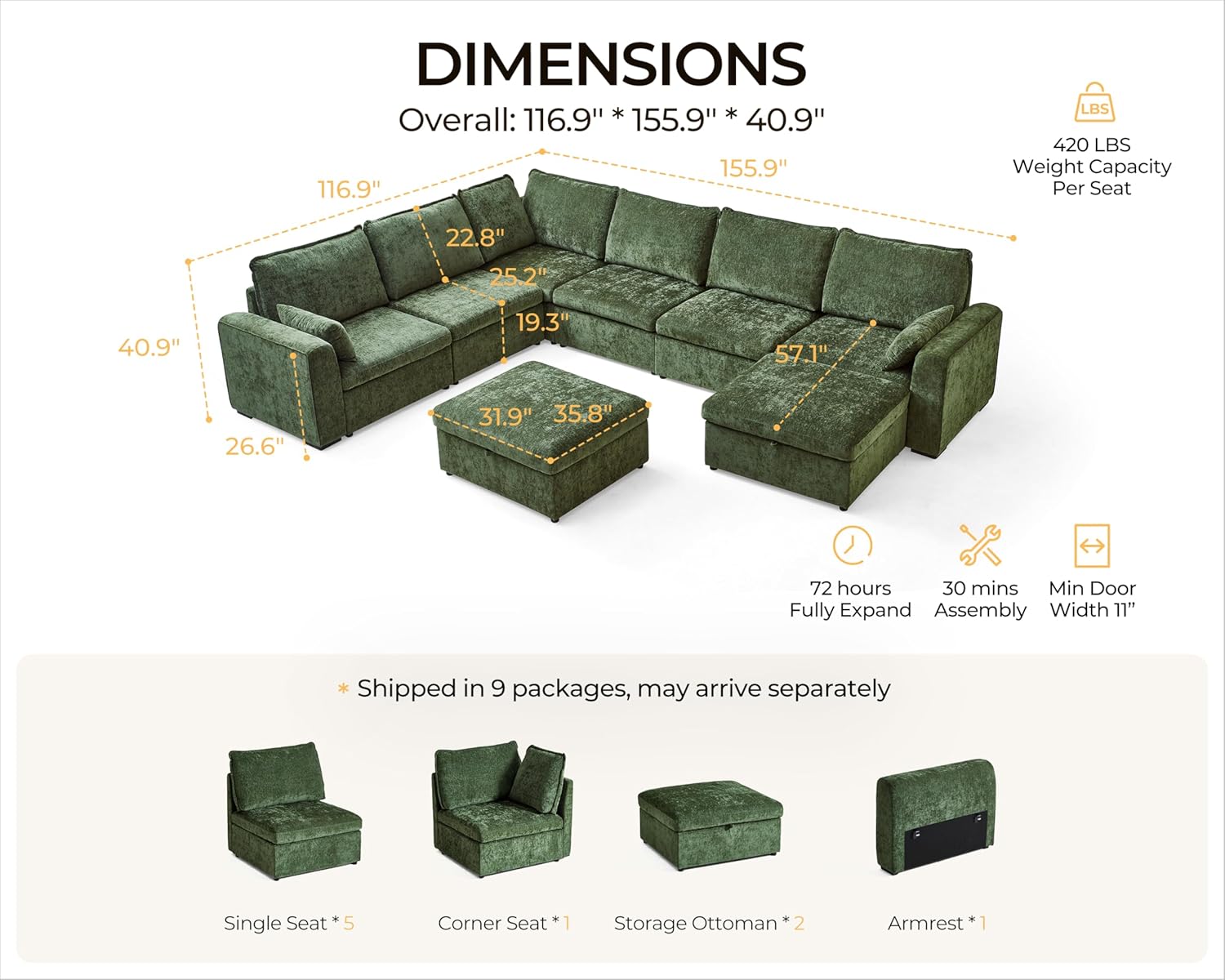 • 【Multiple Packages & Dedicated Support】 Your cloud modular sectional couch ships in 9 separate packages, which may arrive at different times. If you receive only some boxes, don’t worry—more are on the way! Need additional tracking details or assistance? We’re happy to help—just reach out! Our team is here to ensure you receive everything as expected and guarantee a smooth, hassle-free shopping experience with your complete satisfaction