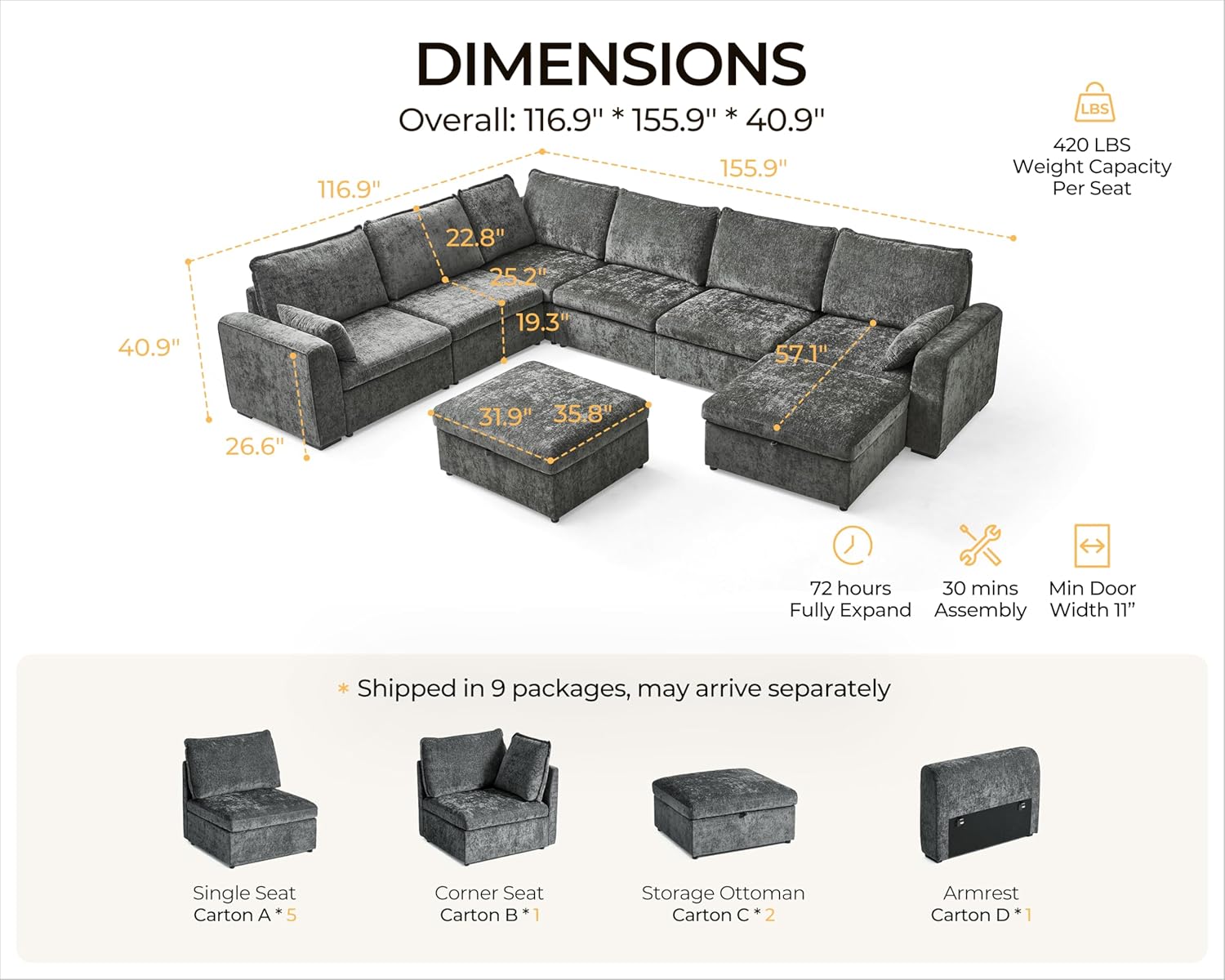 • 【Multiple Packages & Dedicated Support】 Your cloud modular sectional couch ships in 9 separate packages, which may arrive at different times. If you receive only some boxes, don’t worry—more are on the way! Need additional tracking details or assistance? We’re happy to help—just reach out! Our team is here to ensure you receive everything as expected and guarantee a smooth, hassle-free shopping experience with your complete satisfaction