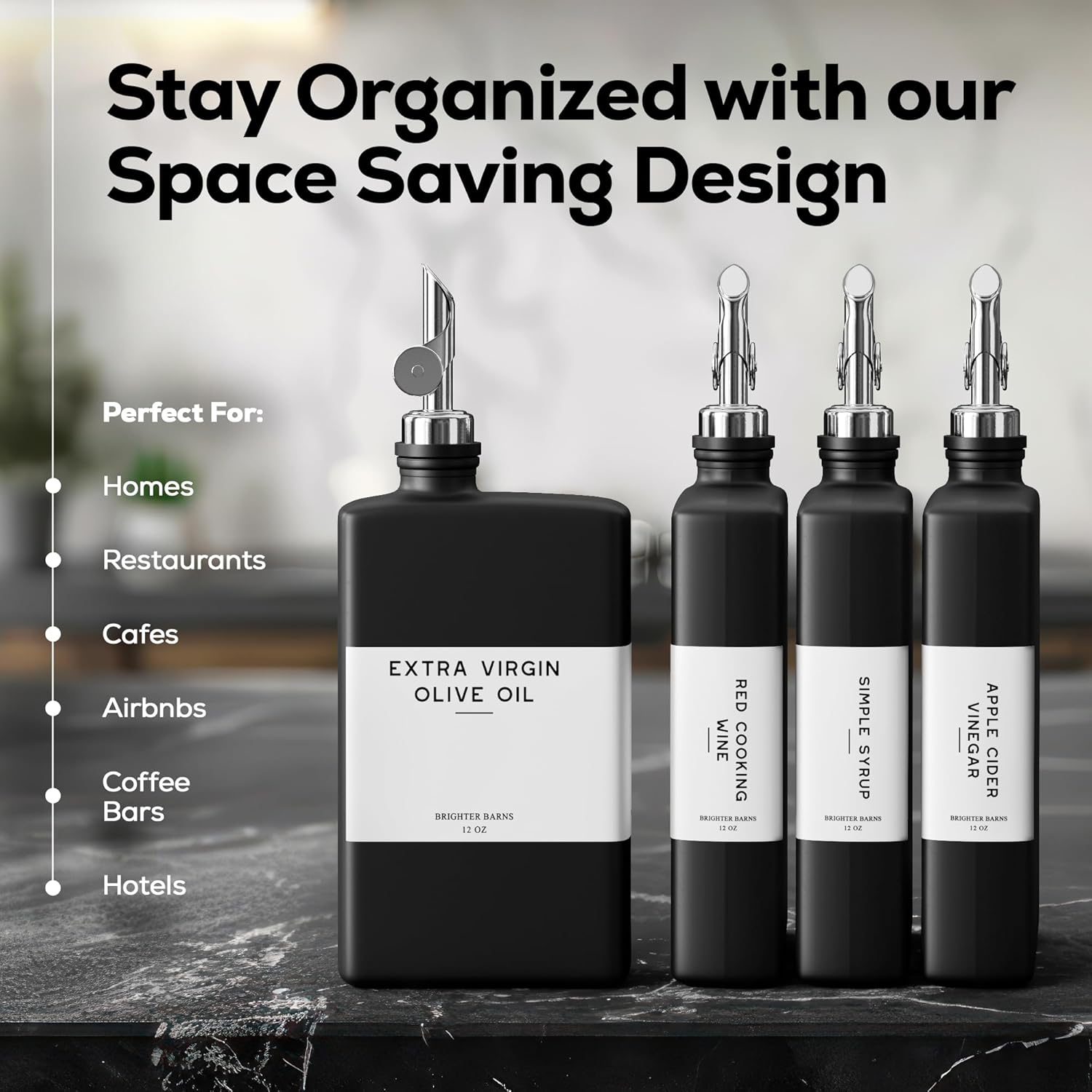 • ELEVATE YOUR SPACE & STAY ORGANIZED - Transform your kitchen with our elegant, space-saving glass oil bottles for kitchen. The sleek, minimalist design not only adds a touch of luxury but also keeps your kitchen organized with its slim, elegant profile. Tailored to blend seamlessly with any decor—from modern and luxury to farmhouse, minimalist, neutral or vintage, this is the kitchen decor upgrade your home, coffee bar, Airbnb, café, or restaurant has been waiting for.