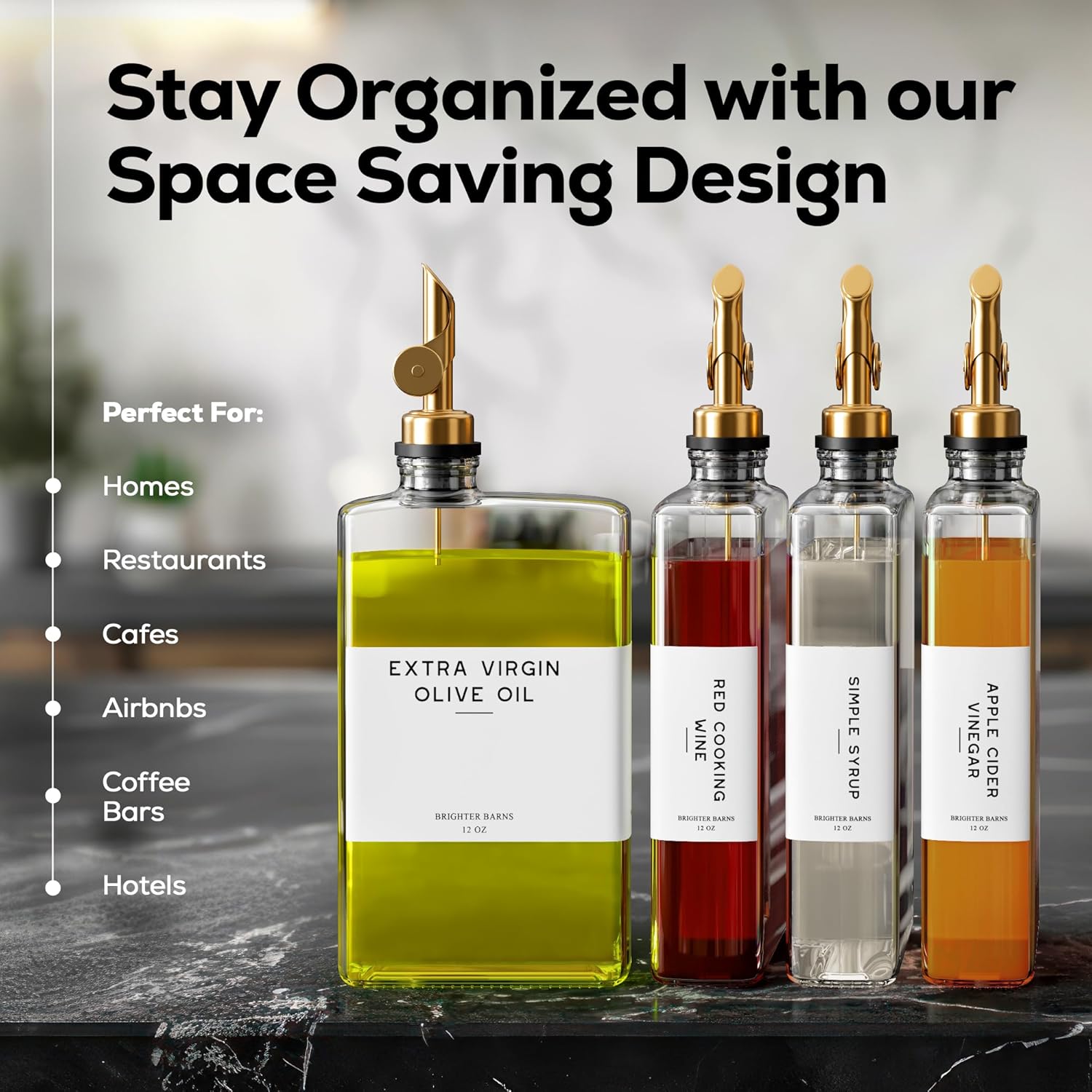 • ELEVATE YOUR SPACE & STAY ORGANIZED - Transform your kitchen with our elegant, space-saving glass oil bottles for kitchen. The sleek, minimalist design not only adds a touch of luxury but also keeps your kitchen organized with its slim, elegant profile. Tailored to blend seamlessly with any decor—from modern and luxury to farmhouse, minimalist, neutral or vintage, this is the kitchen decor upgrade your home, coffee bar, Airbnb, café, or restaurant has been waiting for.