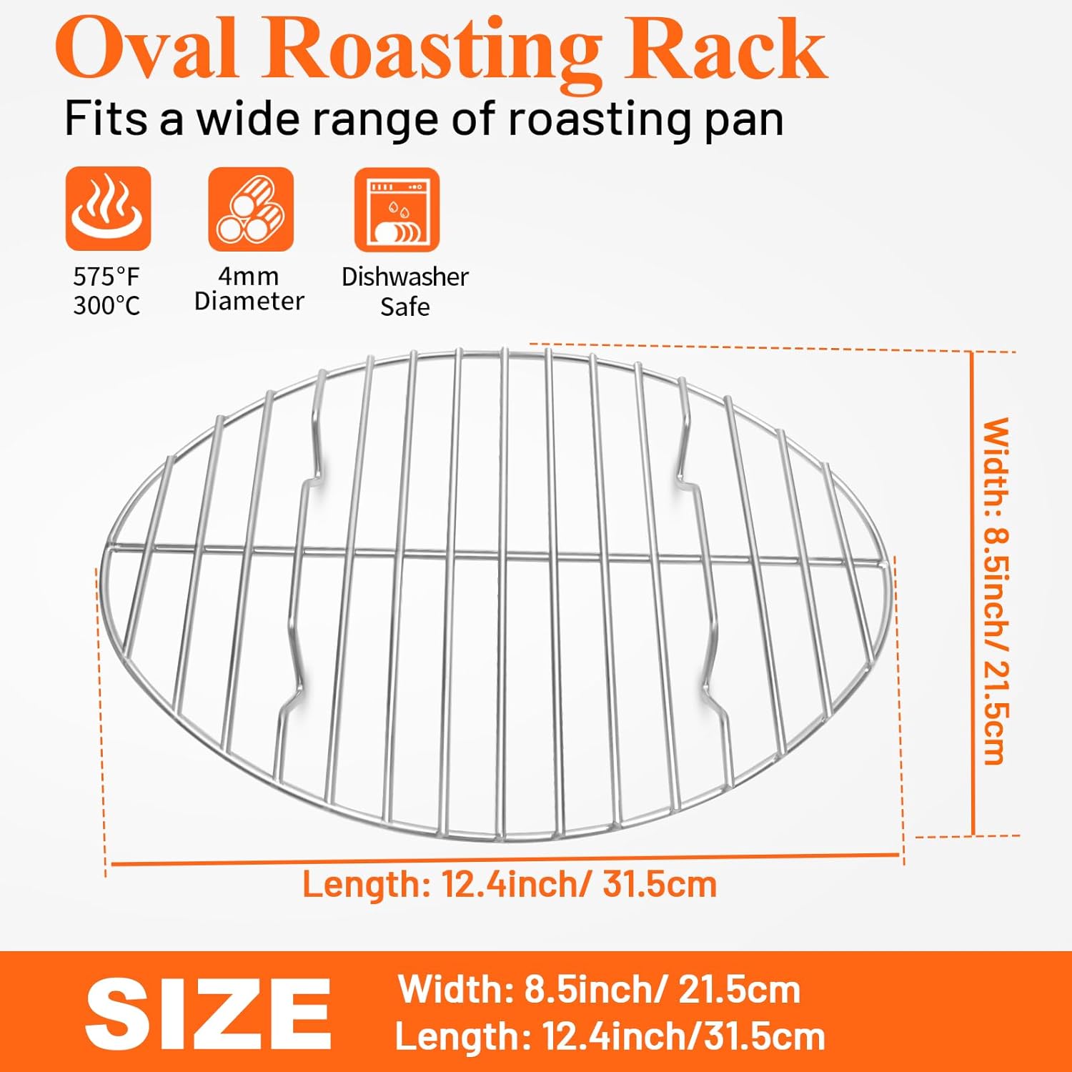 • The 12.4“ x 8.5” size fits most roasting pans, and the oval frame and tight grid spacing hold a variety of foods securely in place without worrying about dropping them