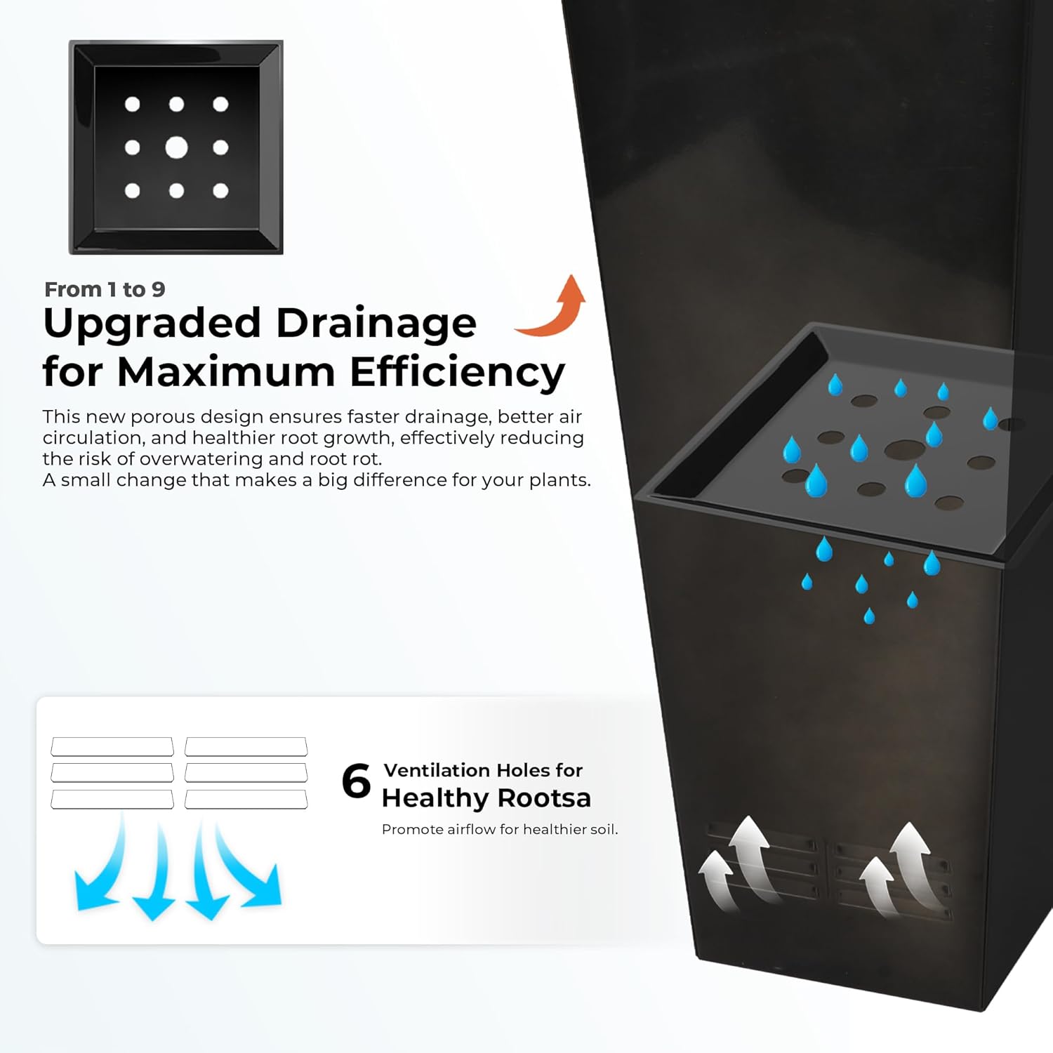 • Elegant Tall Square Design: Featuring a modern tapered silhouette with a high-gloss black finish, these planters bring a sleek and contemporary look to patios, entryways, and interiors.