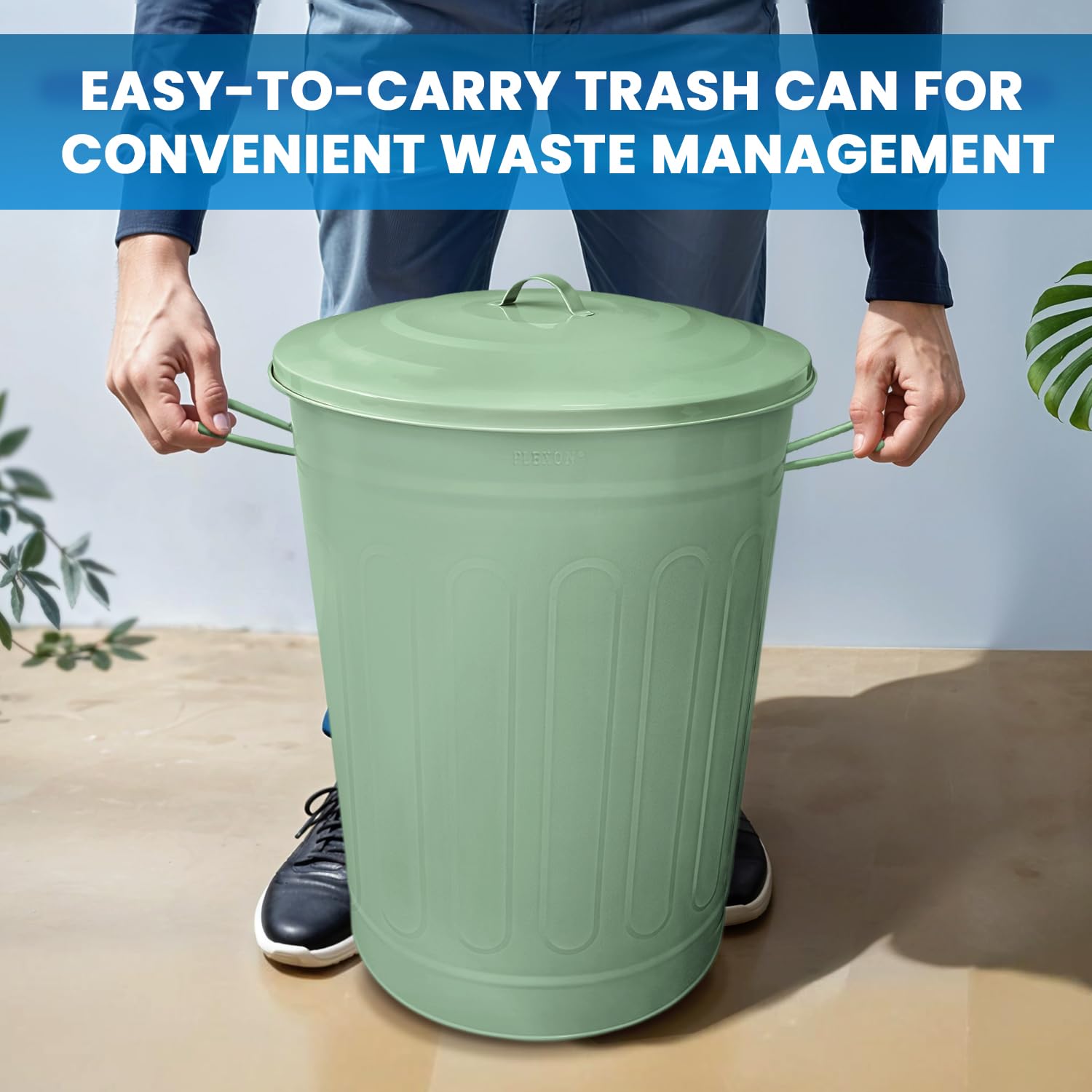 Plexon Round Trash Can 13 Gallon, Vintage Metal Outdoor Trash Can with Lid, Retro Farmhouse Garbage Container, Old School Modern Ash Bucket, Green