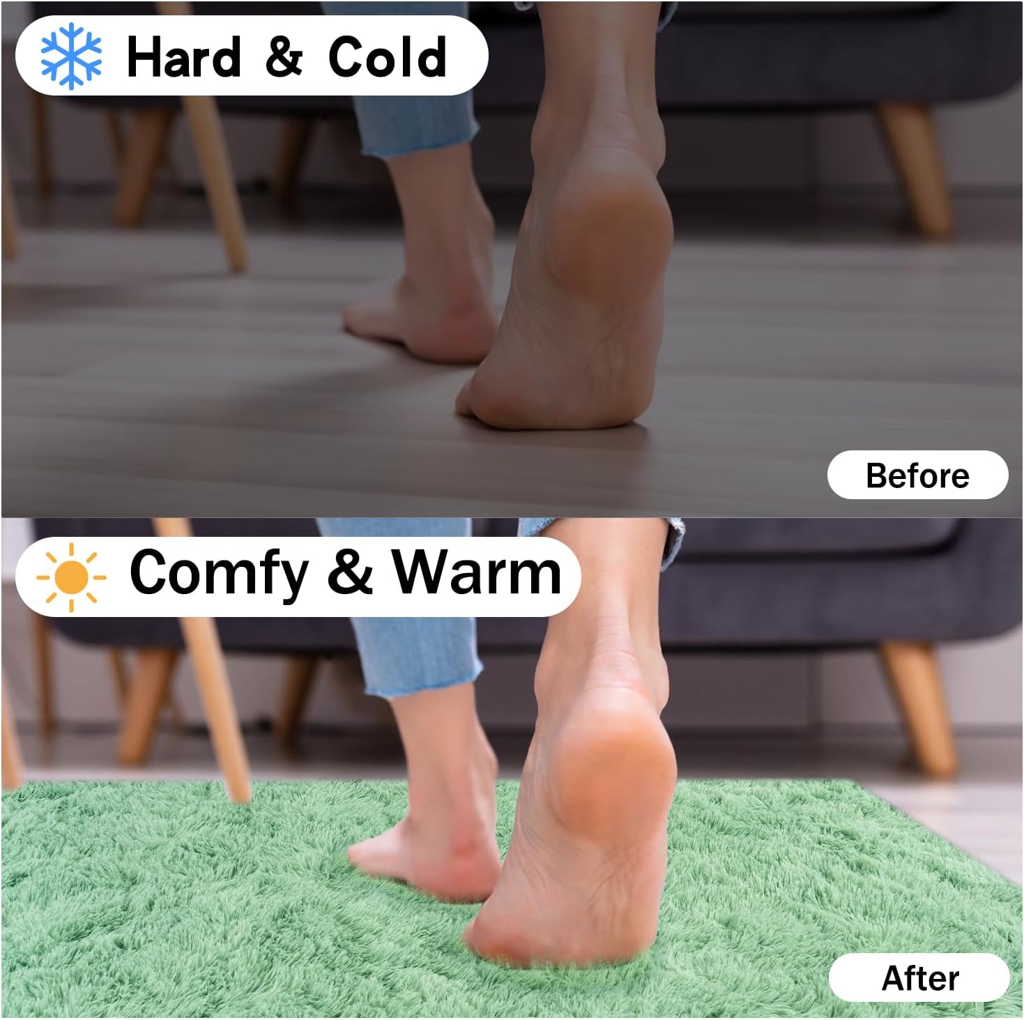 • Rezutan Area Rugs-Soft Fluffy Rug: The Rezutan shag area rug is crafted from durable microfiber, ensuring a plush and incredibly comfortable experience. Its 1.7-inch high pile surface is dense and velvety to the touch, while the 0.3-inch memory foam provides superior cushioning, isolating you from the cold ground and offering soundproofing benefits. Because of the plush fur on the Soft Fluffy rug, you’ll feel like walking on the clouds when walking barefoot on the large bedroom rugs.