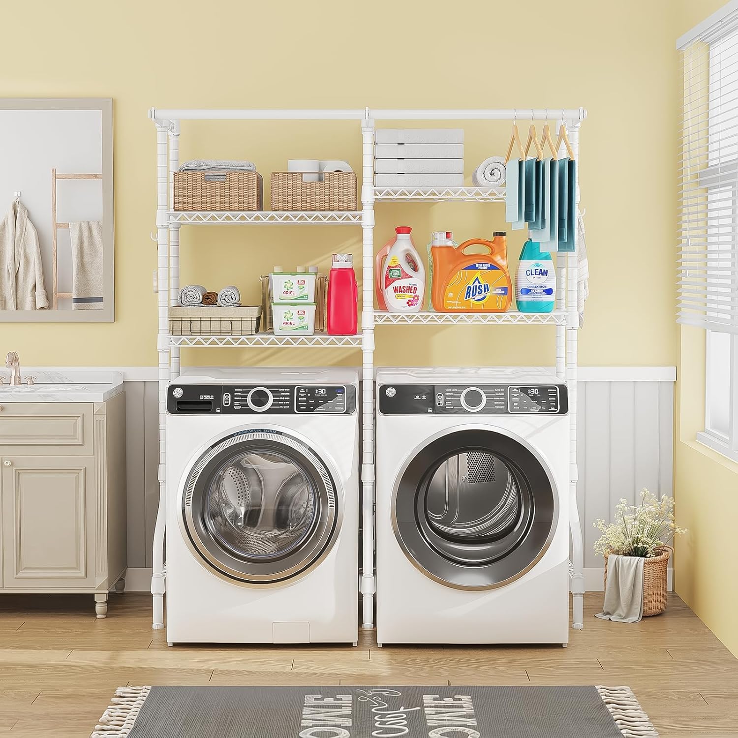 • [Smart Space Optimization]: The 4 pieces of metal shelves can organize and store laundry detergent, washing powder and liquid, and other accessories. The 2 clothes hanger rods allow vertical clothing drying and do not affect storage space