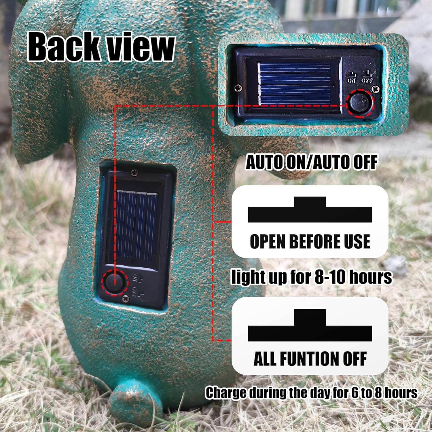 • 【Solar Powered】This rabbit statue decoration is equipped with a solar panel. On the back of the rabbit statue, the solar panel converts solar energy into energy and stores it in the battery, which can be charged during the day and opened at night. Please open the button on the back before use.