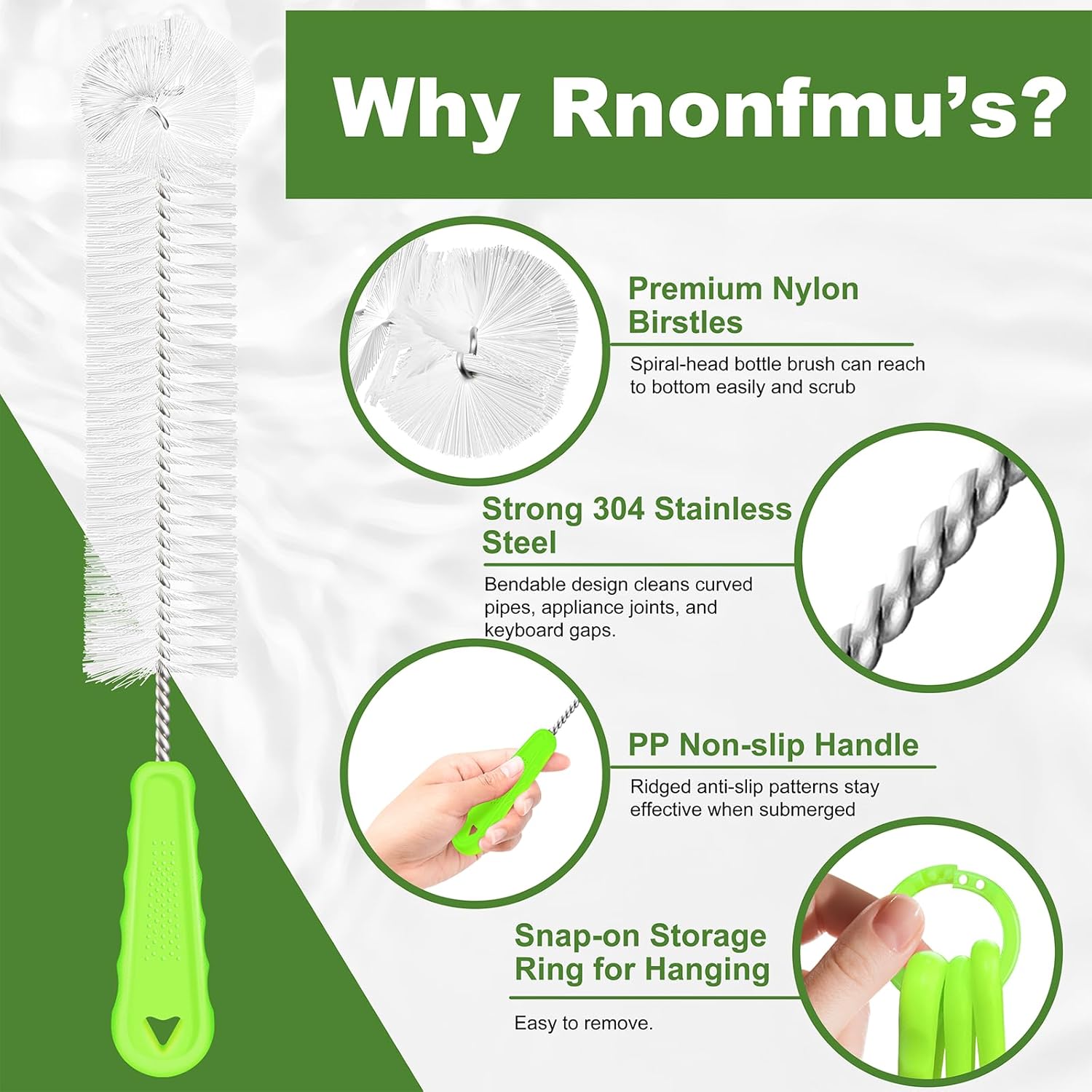 • Gentle Yet Effective Brush Kits: Rnoafmu bottle cleaning brushes includes 14 in large bottle brush (50mm width), 13 in ultra-slim straw brush (10mm width), 5 in(10-25mm) tapered lid brush and a storage ring. Perfect combo for tumblers, baby bottles, sports water bottles and hard-to-reach areas.