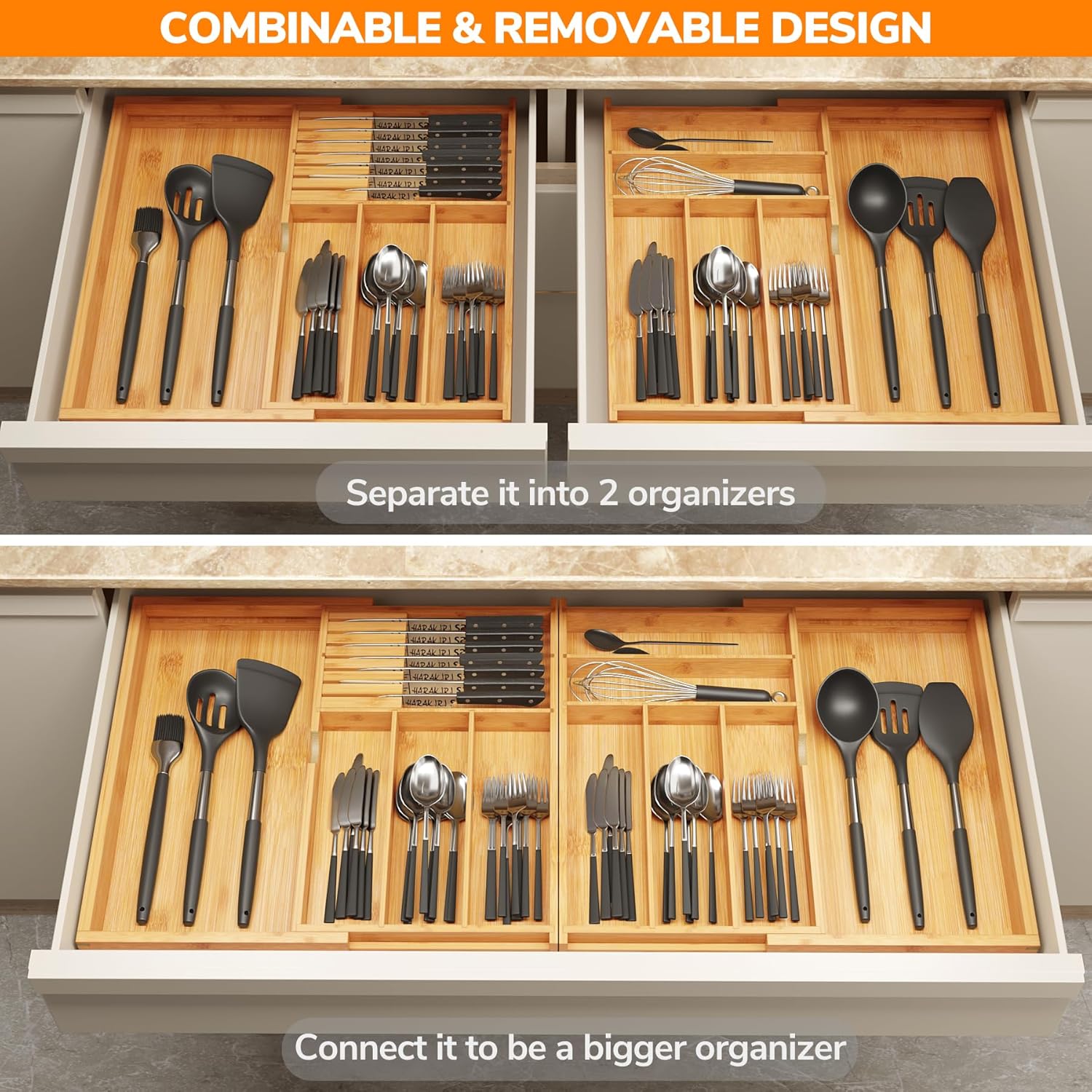 • Flexible & Expandable Design: Flexibility to combine or use individually as needed to accommodate a variety of drawer sizes. Combined use expand from 21.3" to 36" for extra-large storage space. Different sized compartments can accommodate utensils of all dimensions, making it a versatile addition to your kitchen storage solutions. The bamboo's durability and stability ensure that the expandable design won't affect its stability, providing a smooth pull every time.