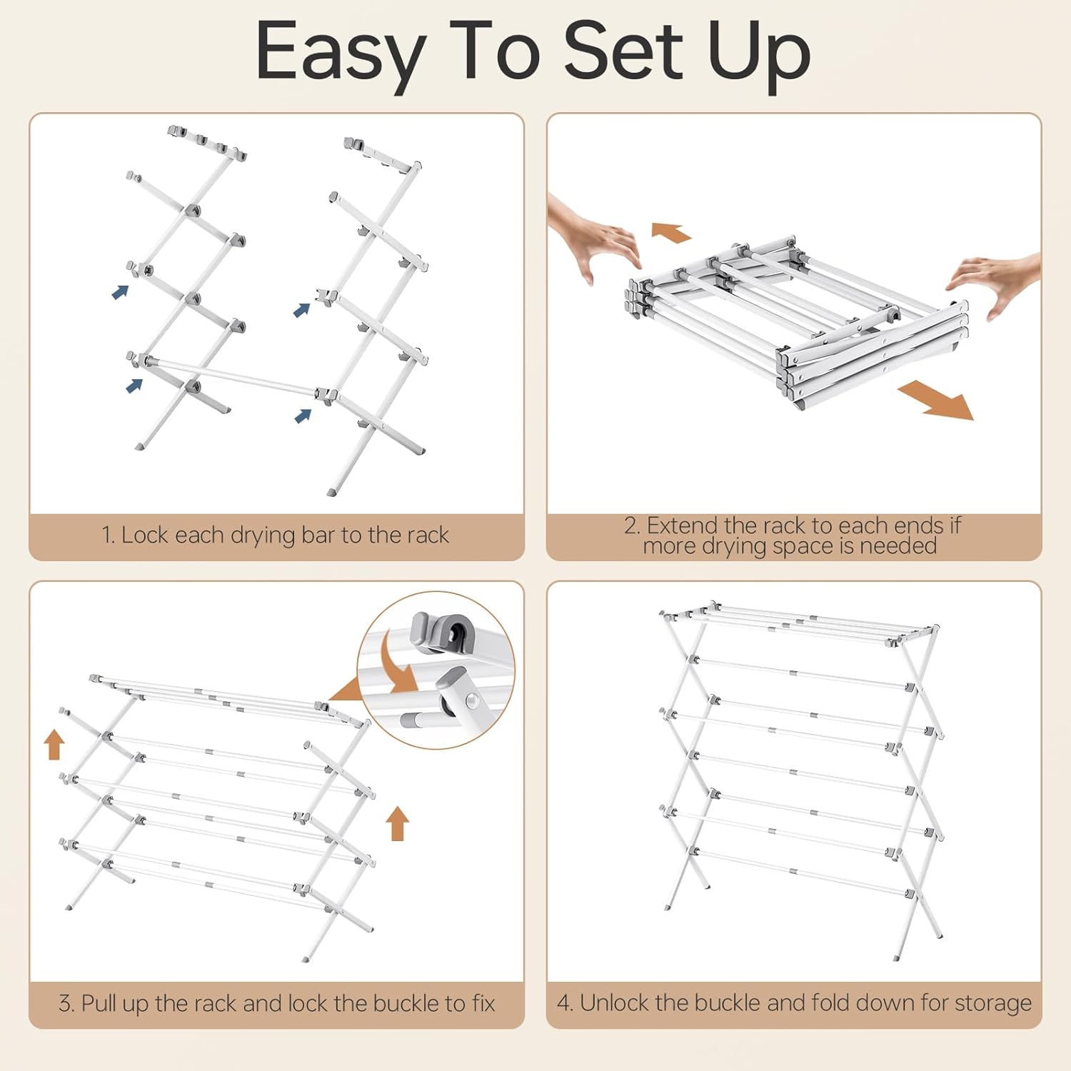 • Easy Assembly - The small laundry drying rack is super easy to put together. Just snap each bar into place and snap the end piece in on top tier for locking