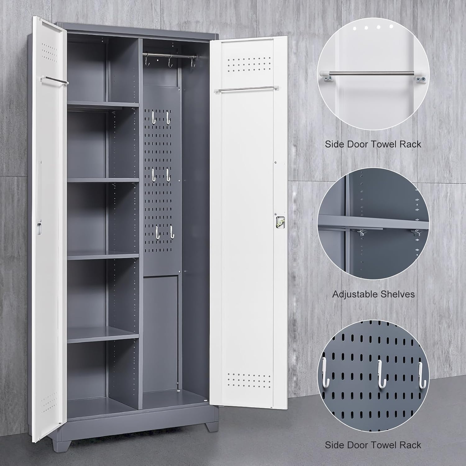 Garage Storage Cabinet,Broom Closet with Lock,Locking Cabinets with Hanging Rod & S-Hooks for School,Garage,Grey-White