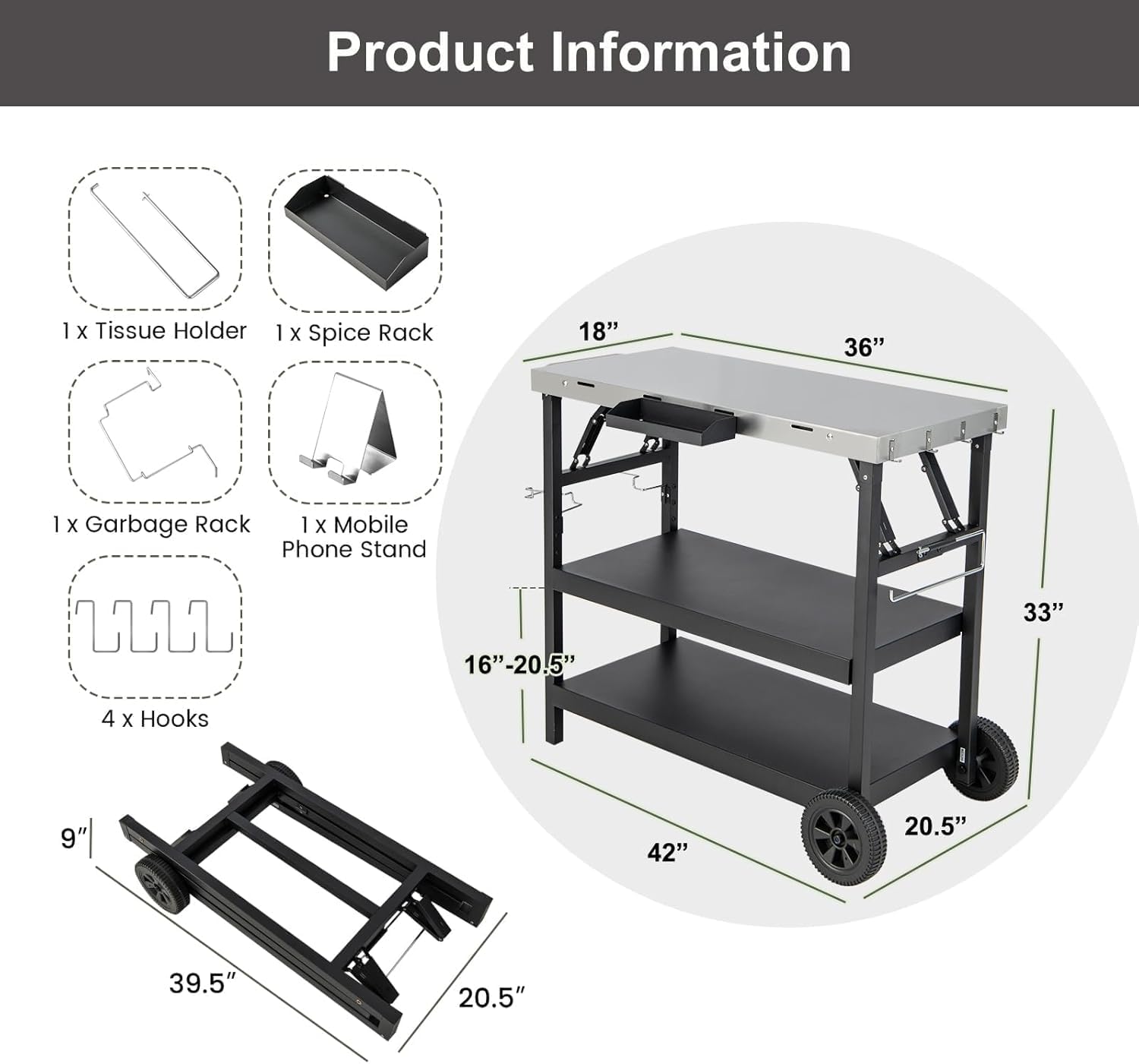 • 【Food-Safe Prep Surface】: 201 stainless steel tabletop (18"x 36"), weight capacity of tabletop: 110 lbs.