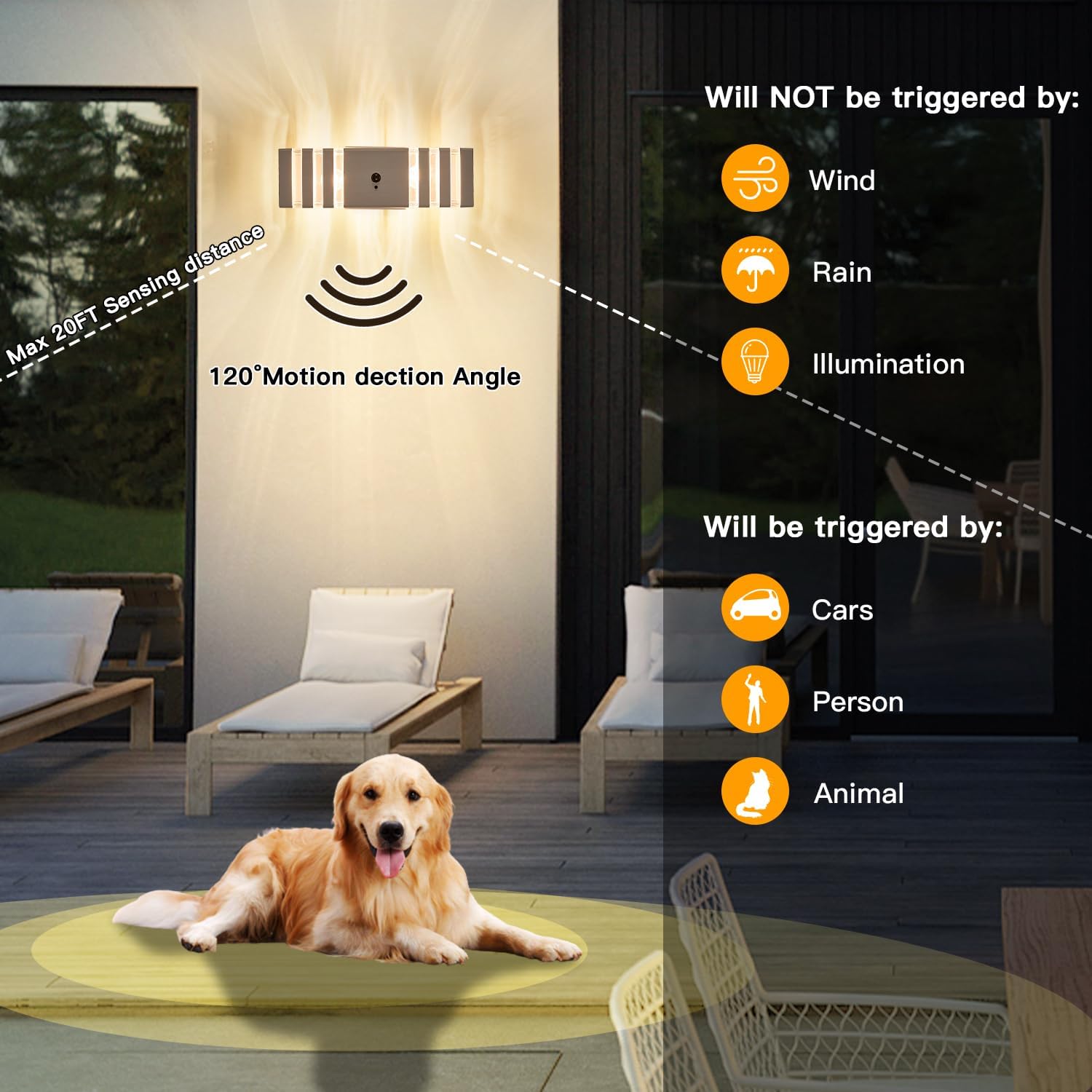 • ❗❗❗【Upgraded Motion Sensor】These motion sensor outdoor lights combining the advanced PIR motion sensor & IC light sensor. Featuring with dusk to dawn function, these motion sensor lights will auto turn on at dusk and off at dawn. Furthermore, with upgraded motion sensor, the outdoor motion sensor lights will auto light up your space with full brightness when motion detected at night.