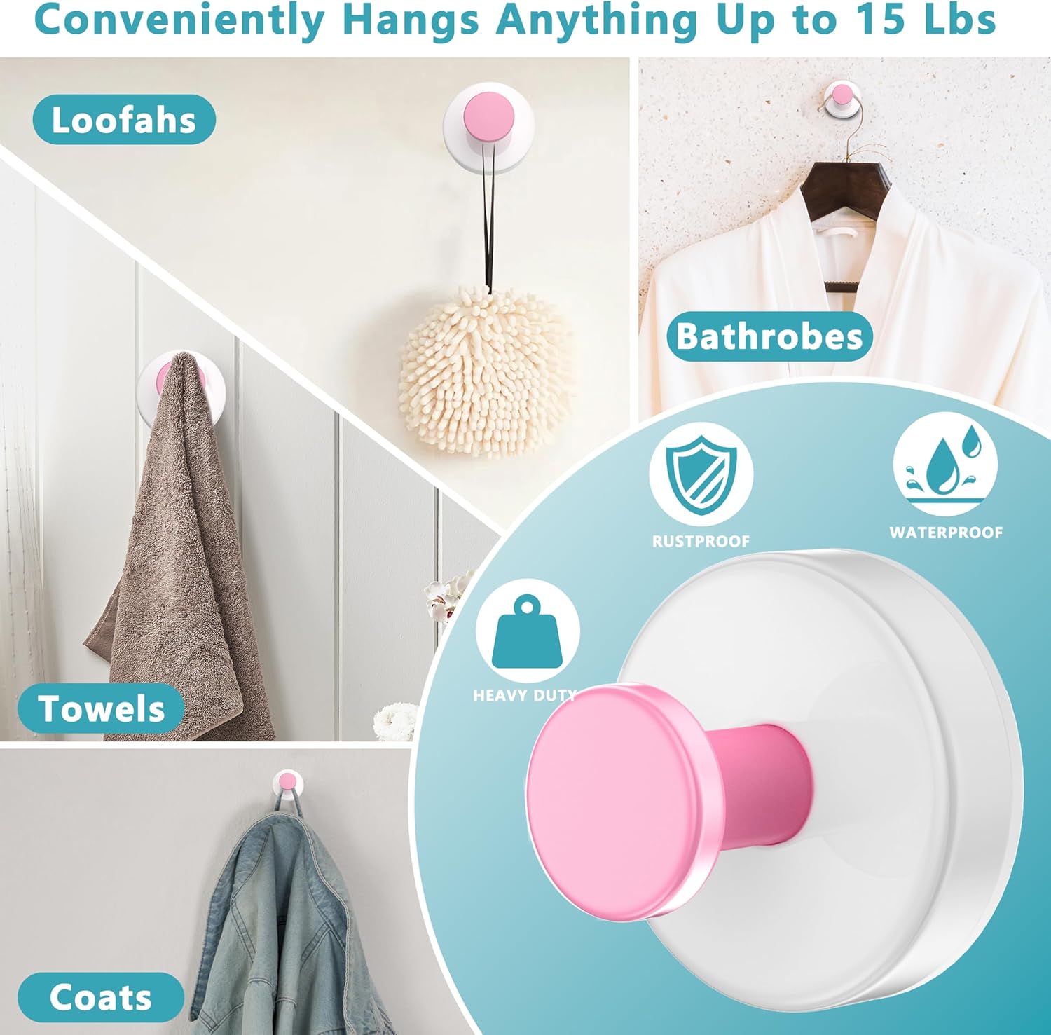 Suction Cup Hooks for Shower,Removable No Drill Towel Hooks,Upgraded 15 lbs Strong Suction hooks for Bathroom Tile,Shower Wall,Glass Door,Kitchen-Loofah,Coat,Stainless Waterproof-White Pink 2 Pcs