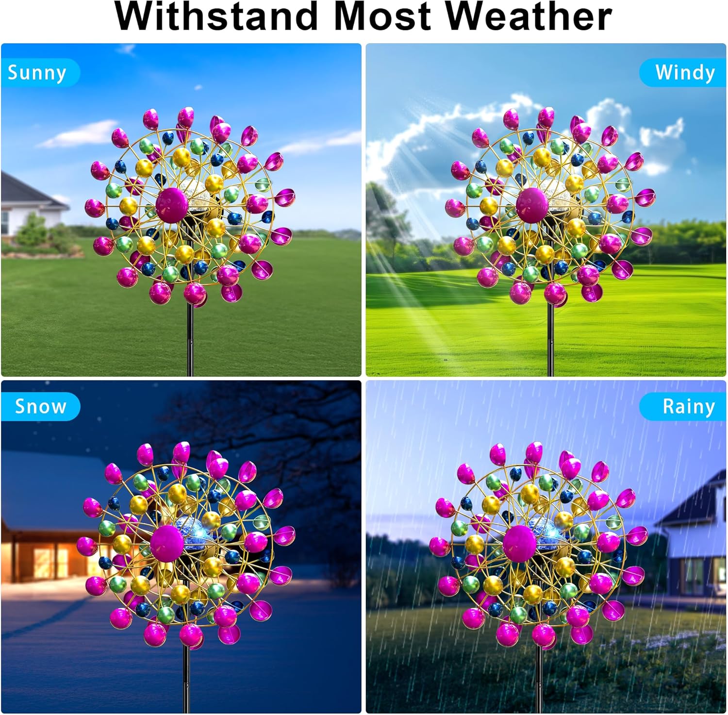 • Eye-Catching Ferris Wheel Design: This solar-powered windmill light features a unique ferris-wheel-shaped frame with colorful, iridescent blades that glisten in the sunlight. The vibrant, multicolored globe beads add a touch of whimsy and charm, creating a magical and captivating focal point in any outdoor space.