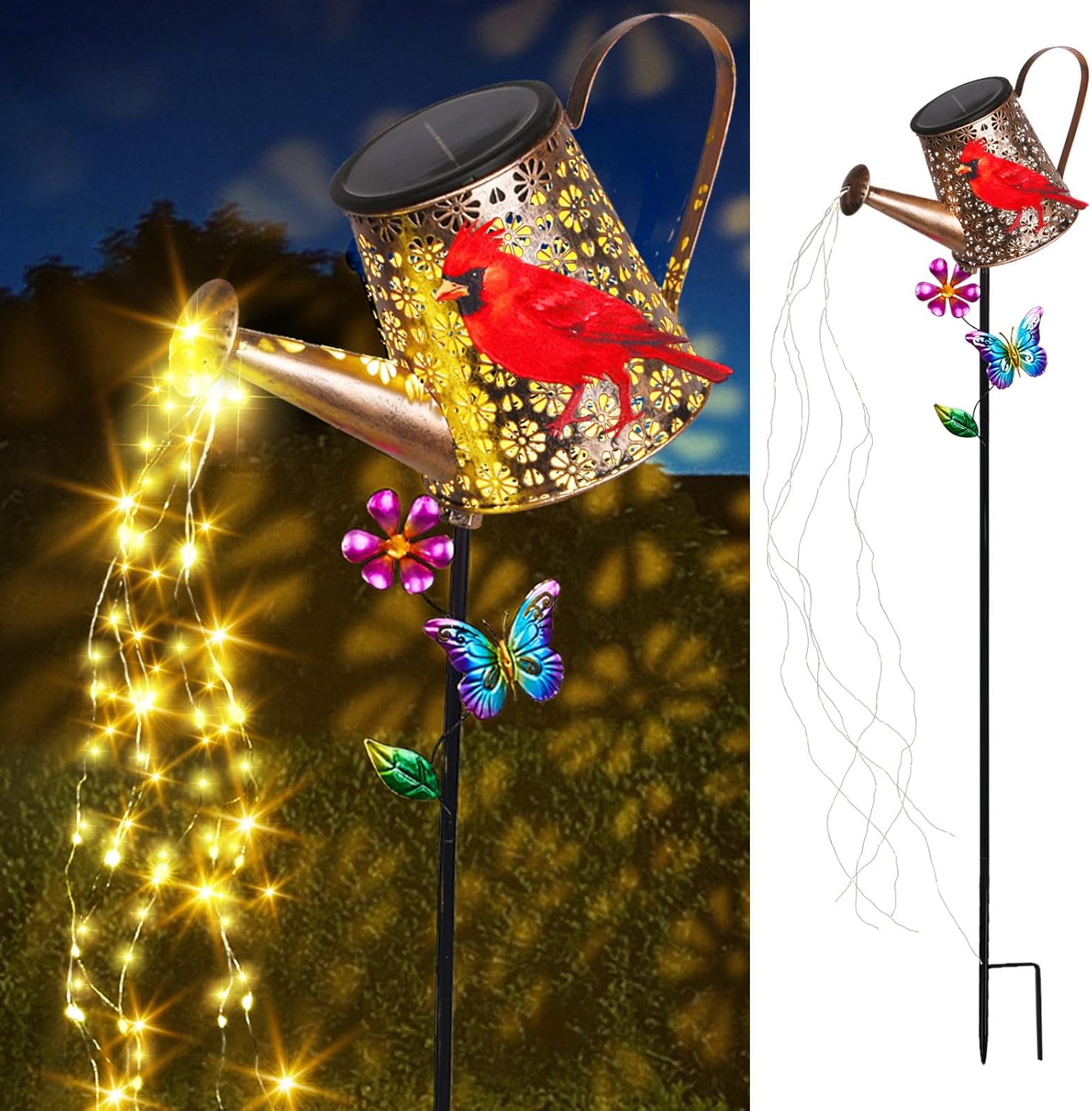 • Unique Garden Decor:This watering can with light features a charming and eye - catching design. The watering can shape, adorned with a vivid red cardinal and flowers, adds a touch of nature's beauty to any outdoor space.The garden decor comes with 6 strands of LED flashing string lights (60 LEDs), it can be easily bent and shaped into any shape you like, perfect for DIY.