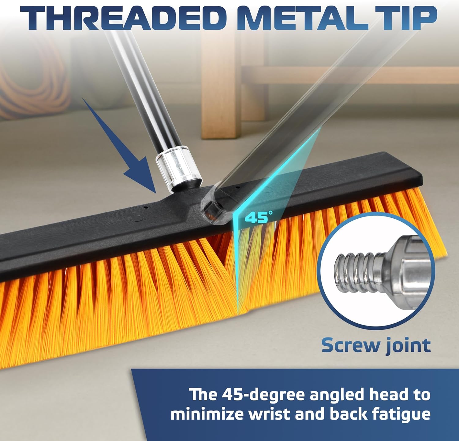• ✅ 6 Row Stiff Bristles: The heavy duty broom has six rows of hard bristles that reach into all hard-to-reach places and remove the dirt. The bristles are strong, do not fall out and are wear-resistant for a long time. The industrial broom features a 45° angled head to effortlessly reach corners and tight spaces.