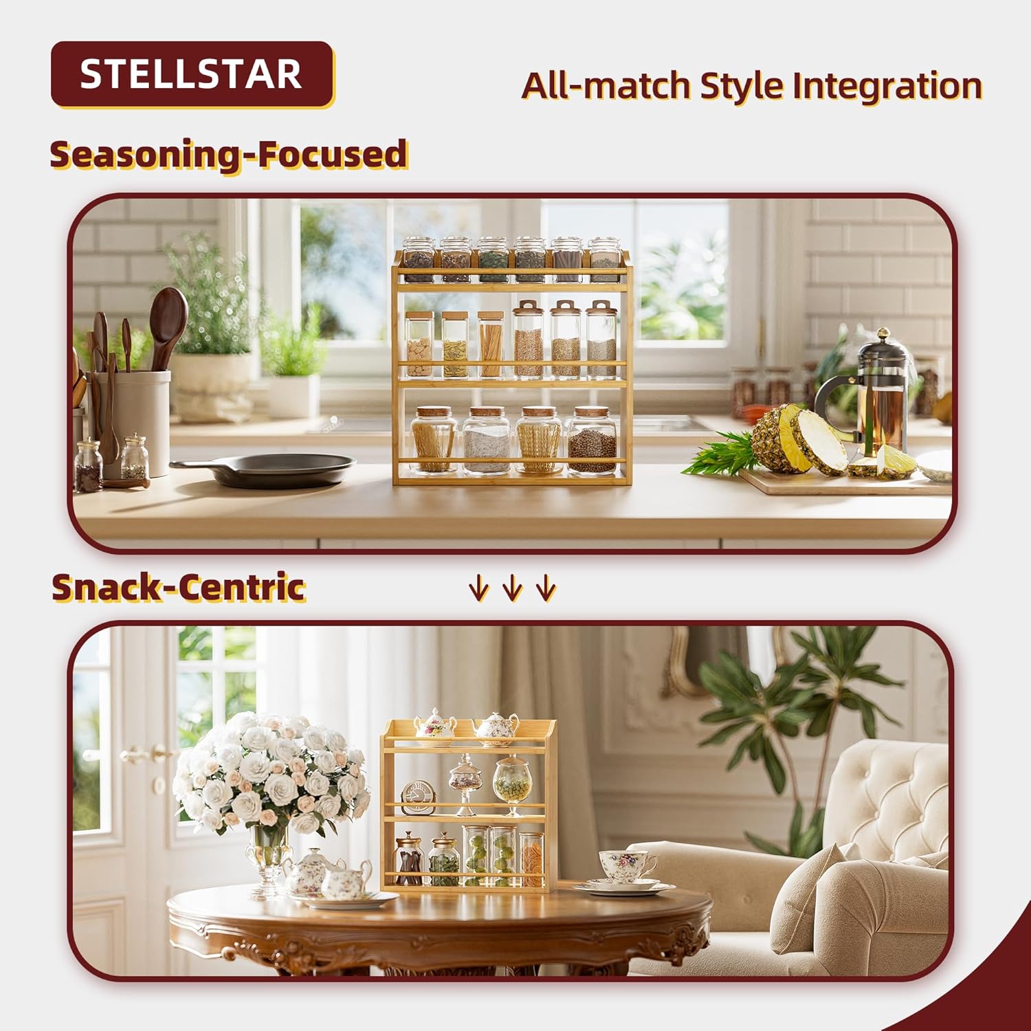 • SIMPLE, ELEGANT & VERSATILE: This rack is both a stunner and a workhorse. Its minimalist design oozes elegance, blending seamlessly with any decor to add warmth. But it’s more than a spice rack! Use it to organize your coffee bar, declutter your bathroom, or neatly stack snacks in mason jars. Wherever you place it—kitchen, pantry, bathroom—it transforms chaos into a tidy, stylish space