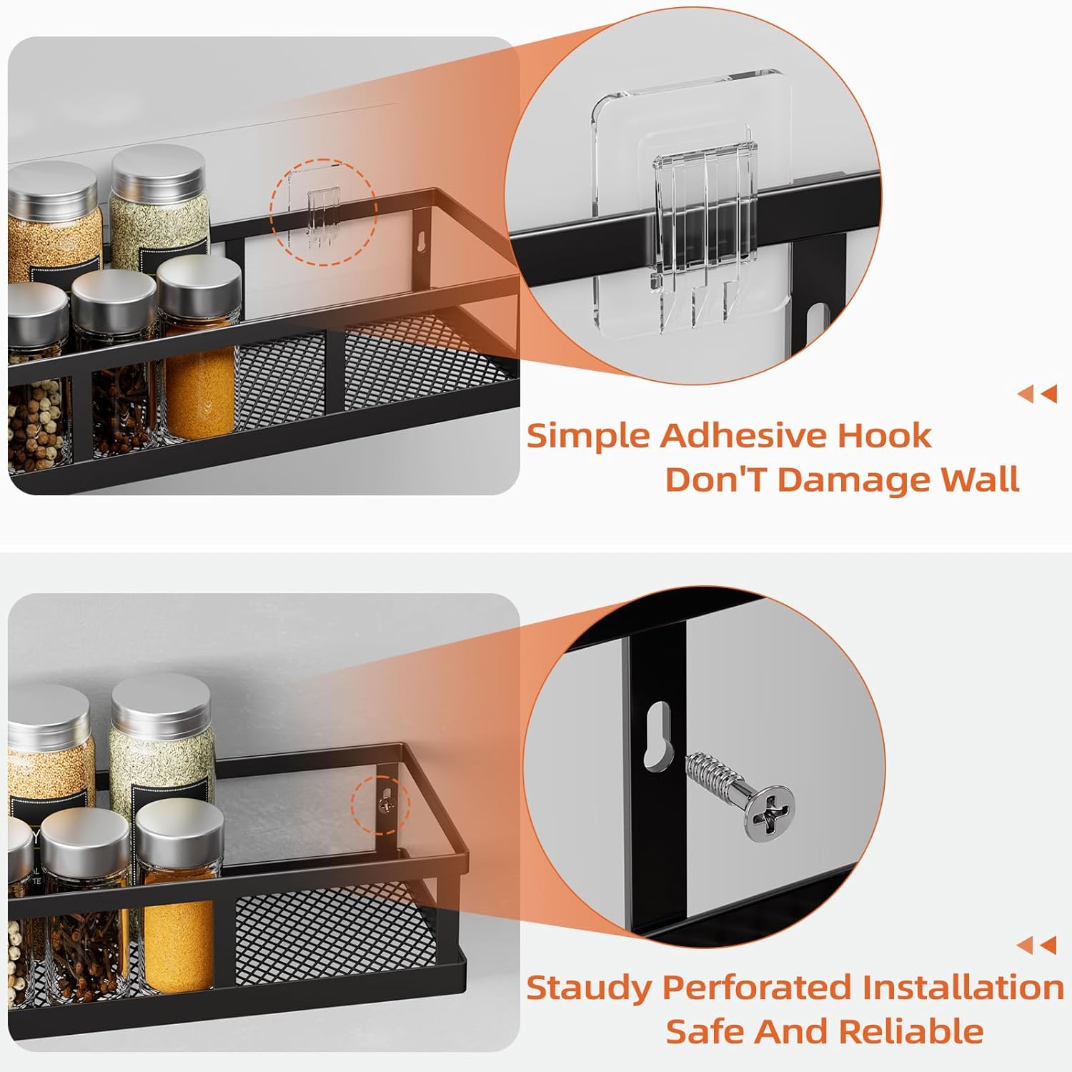 • Premium Metal Material and Stable Storage: The spice rack wall mounted is made of thickened high-strength carbon steel,is waterproof, rustproof, easy to clean.Our spice rack comes with additional 2.76-inch side guards and reinforced adhesive stickers to ensure safety and stability.