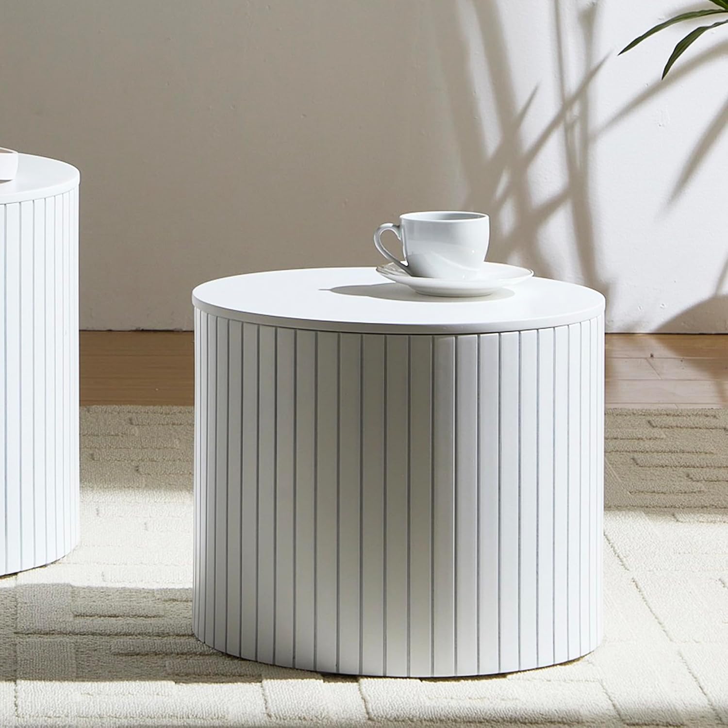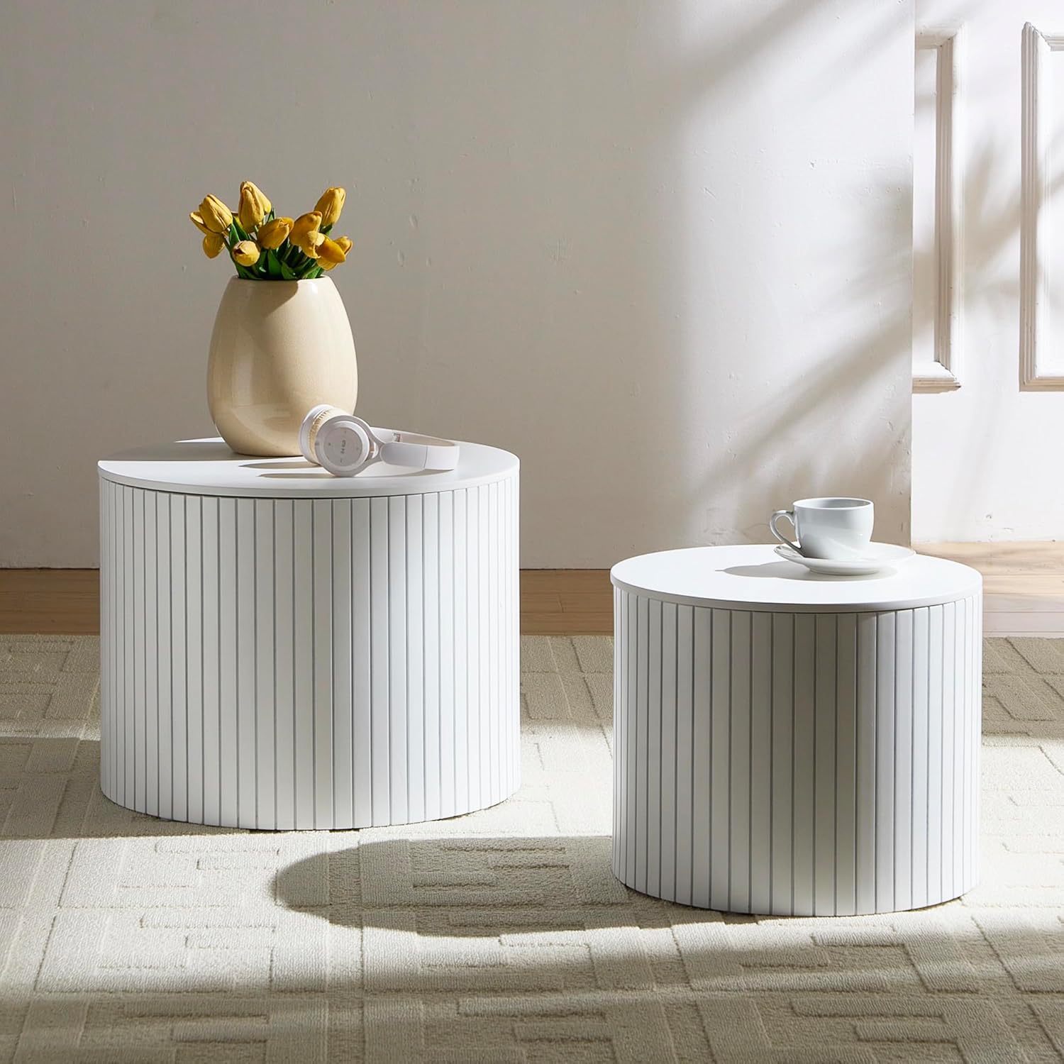 Nesting Cofee Tables Set of 2 with Storage, Modern Round Wooden Coffee Table Circle Side Tables Accent Walnut Table for Living Room, Small Spaces, Bedroom,Balcony, Office(19.17" White)