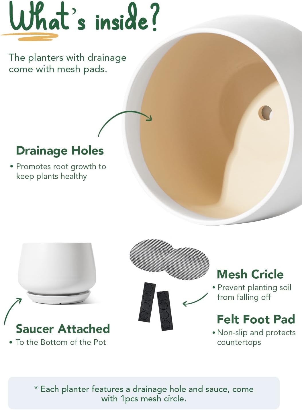 • 10" + 12" Versatile Set: A smarter choice than a single 12" Pot! This planters includes 2 sizes—10 inch and 12 inch body sizes—with an 8 inch opening for the 10 inch plant pot and a 9.8” opening for the 12 inch plant pot, offering the perfect balance of style and practicality. With drainage hole, saucer, mesh pad, and rubber feet, it ensures healthy roots and a tidy home (Plants not included; tray are one-piece design)