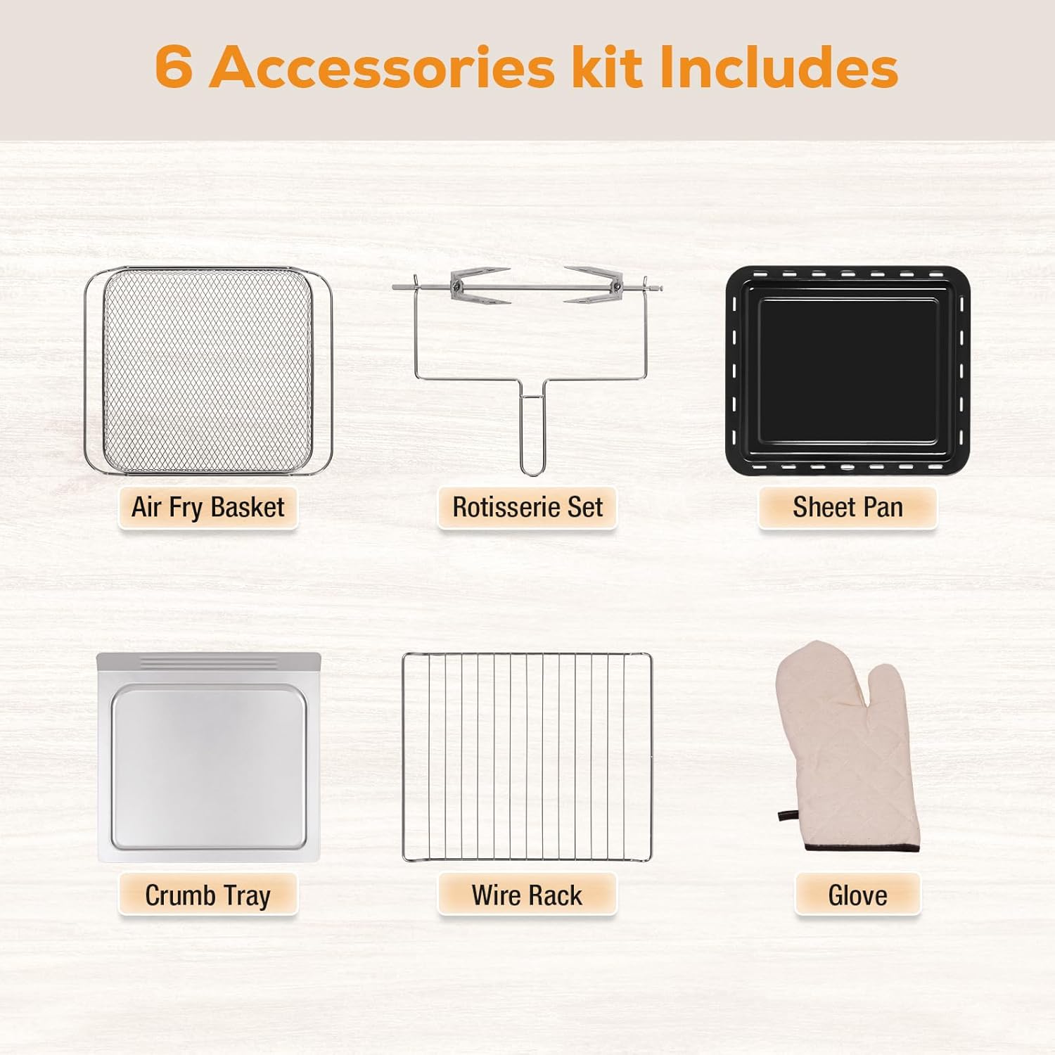 • ๐Ÿ“ฆ 6 Accessories for Everything: Air fry basket, wire rack, crumb tray, rotisserie kit, roast basket and glove.