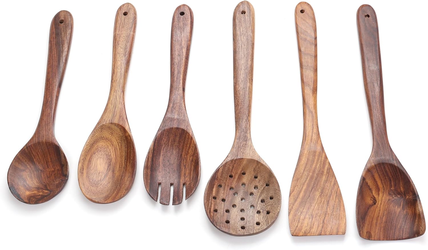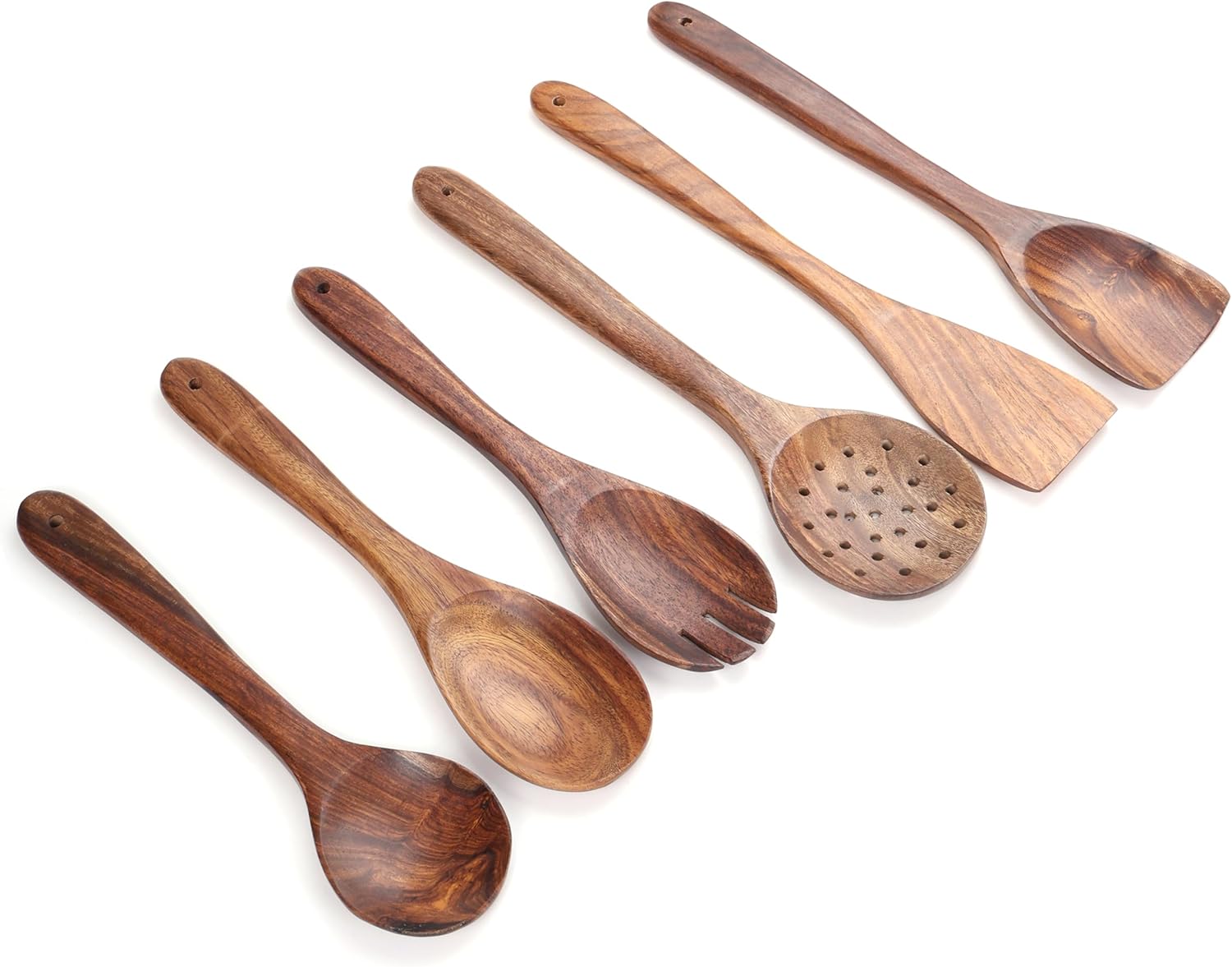 • LIFELONG QUALITY: Woodenhouse kitchen utensils will last a lifetime, they are made of one piece 100% Natural Teak Wood. These tools are beautiful, solid, sturdy, smooth, well designed and have a superb finish. Spoon set will definitely not crack, melt or smell. Utensils may vary in shade because of its natural material.