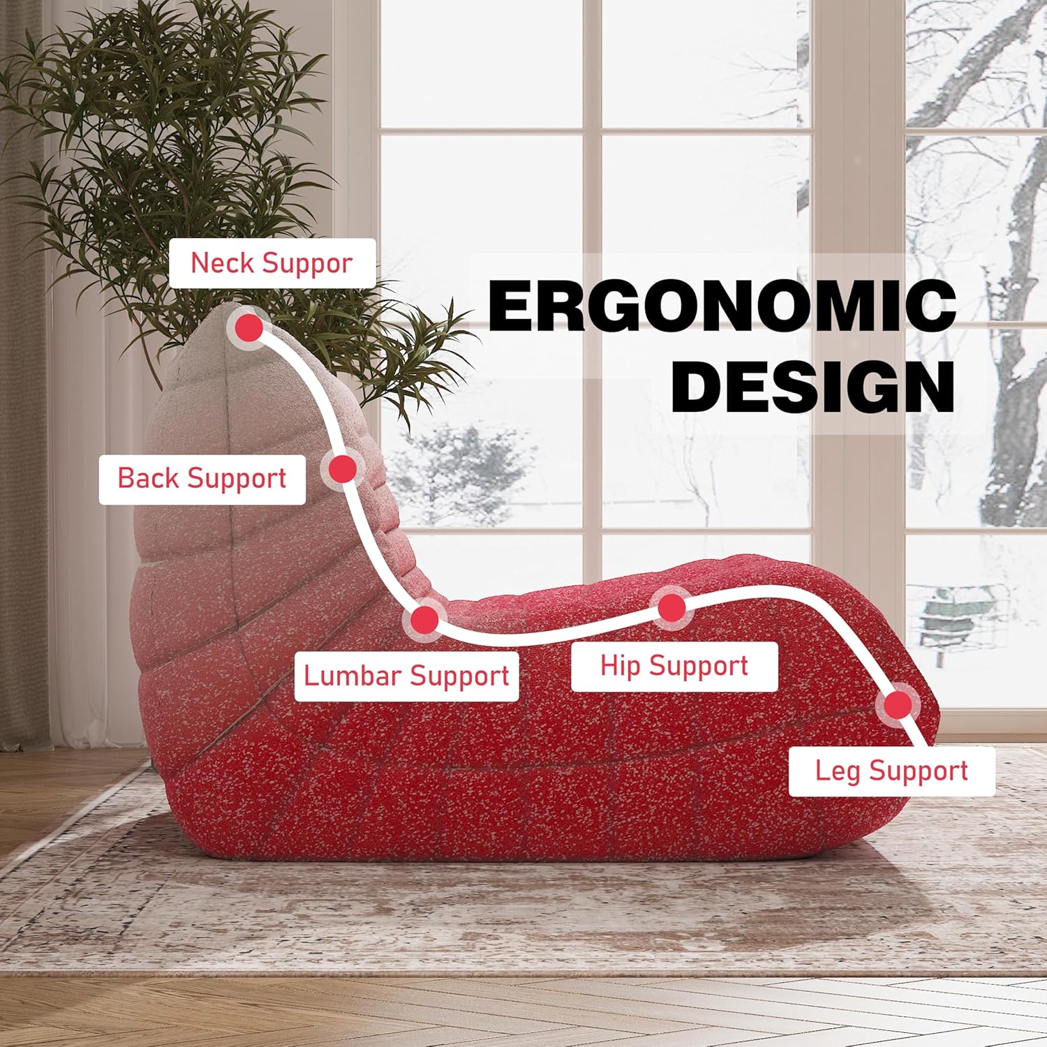 • 【Ergonomic Design】-Designed with your comfort in mind, the bean bag chair features a thoughtful ergonomic design that provides exceptional support for your neck, back, lumbar, hip and leg region. The high-elastic memory foam filling conforms to your body, offering targeted support and ensuring a cozy sitting experience.