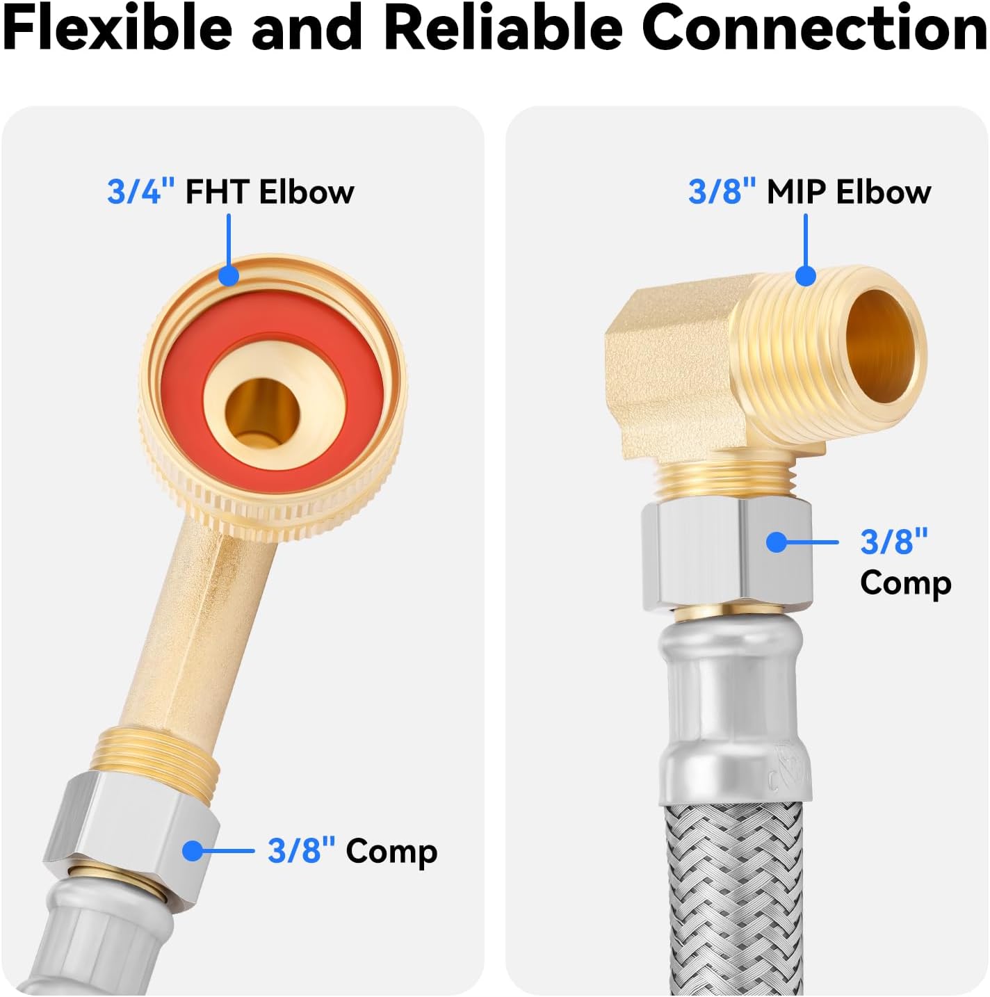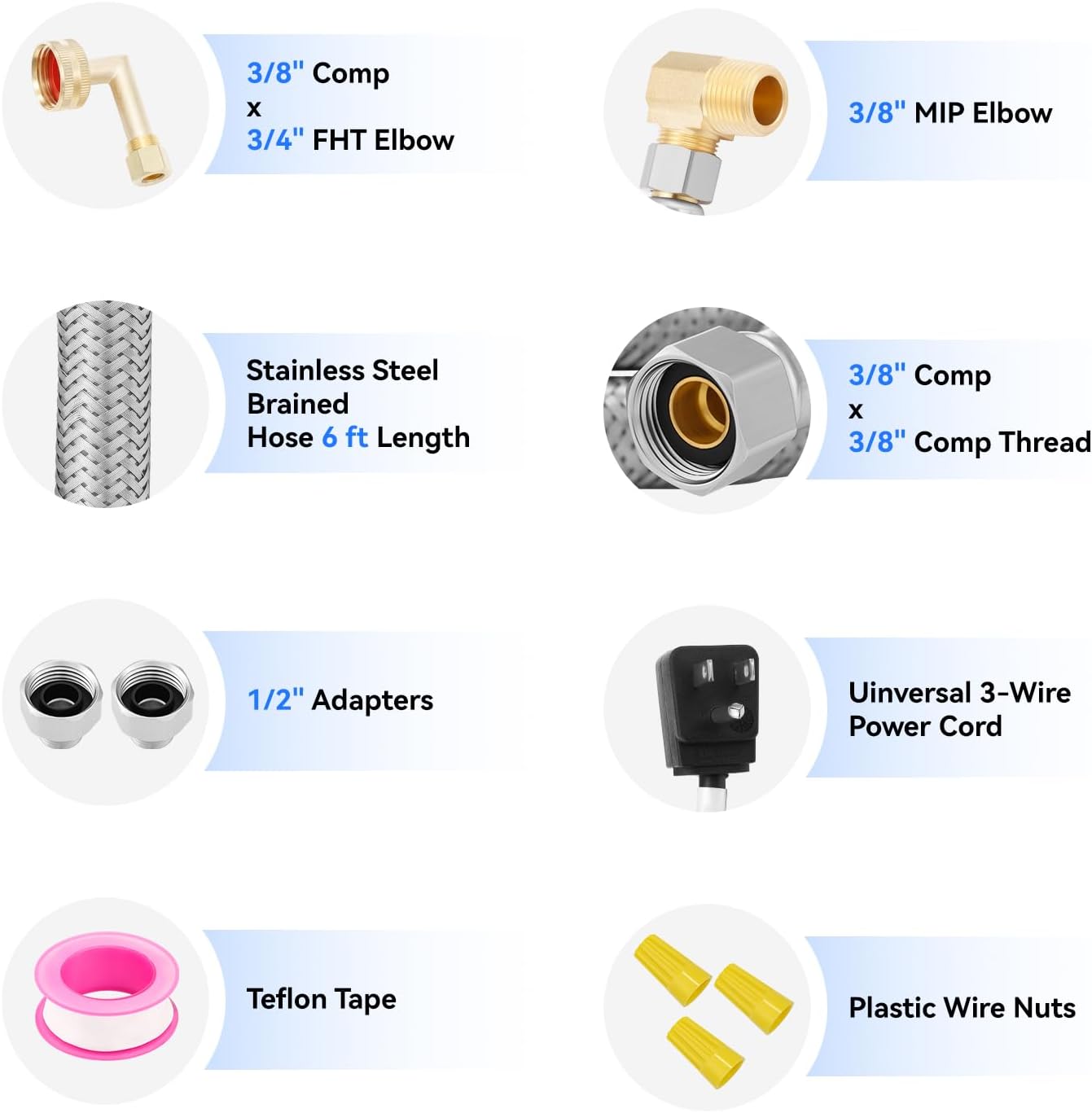 • Complete Installation Bundle: Includes 6ft stainless steel inlet hose, 6ft drain hose (1 pre-bent elbow + trim-to-fit end with clamp), plus adapters, 3-wire power cord, wire nuts, and Teflon tape – all in one kit for full setup.