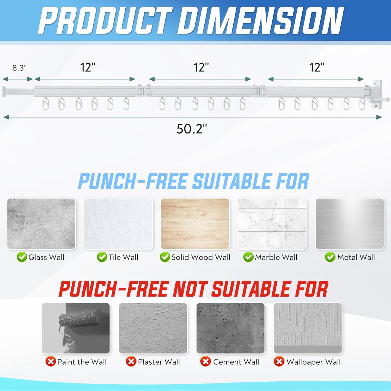 • Wall Mounted Drying Rack(50.2 inch) -- Our wall-mounted clothes drying rack foldable will maximize your space, since it featuring 3 folding sections & a hidden telescopic rod. It is an ideal option for drying various garments such as shirts, towels, socks, hats, coats, suits, dresses, and much more. Its compact and stylish design efficiently aids in organizing your laundry room.