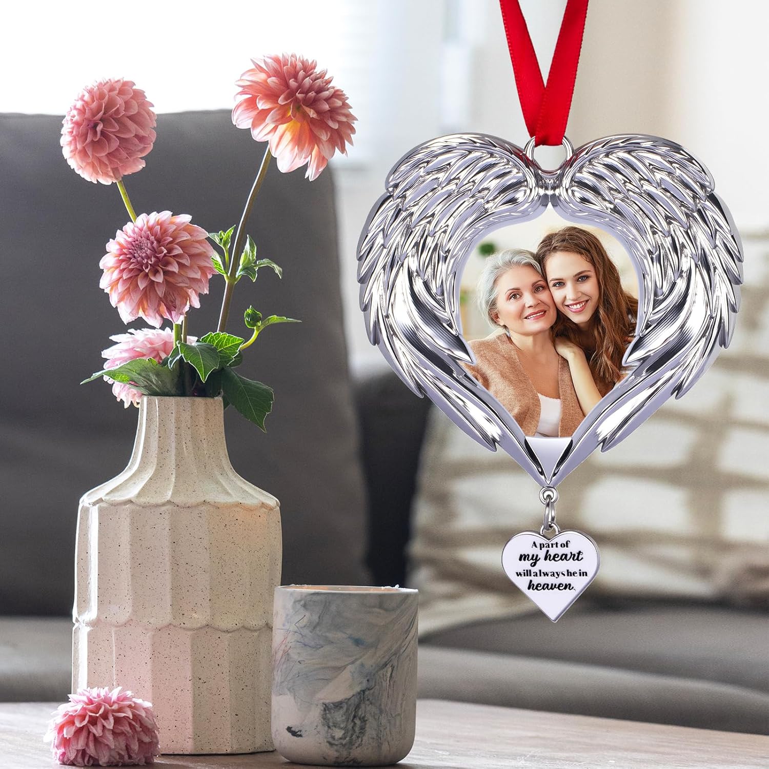 • PERSONALIZED PHOTO ORNAMENT - The Christmas photo ornament designed with angel wings photo ornament and pendant, which is engraved with ‘A Part of My Heart Will Always be in Heaven’; Features a 2.36 x 2.36 inch opening for photo,and the photo ornament measures 3.15 x 3.3 inch