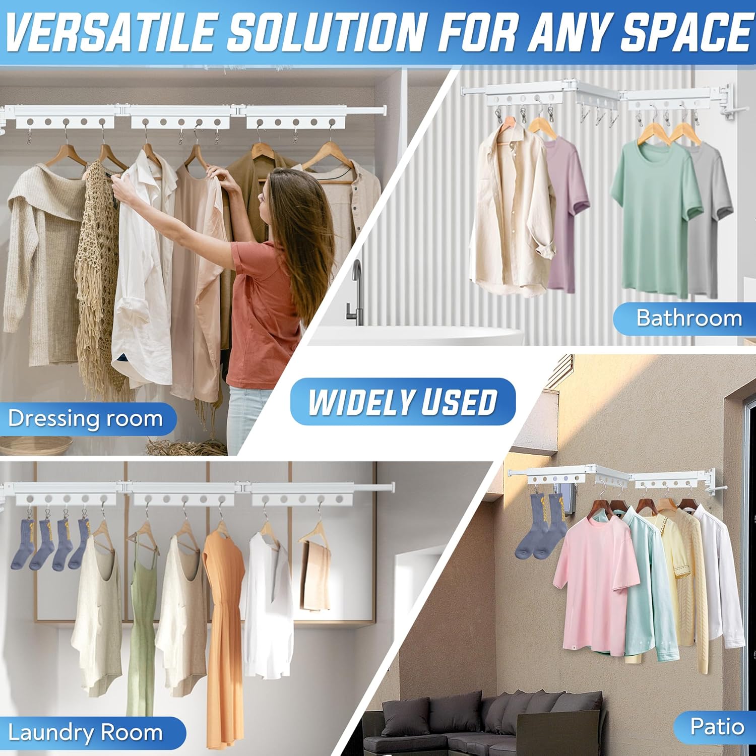 • Premium Material & Craftsmanship -- Crafted from space aluminum, our clothes drying rack wall mounted ensures long-lasting durability without rusting. Its multi-layered paint protection guarantees resistance to acids, alkalis, rust, and corrosion, ensuring robust performance over time.