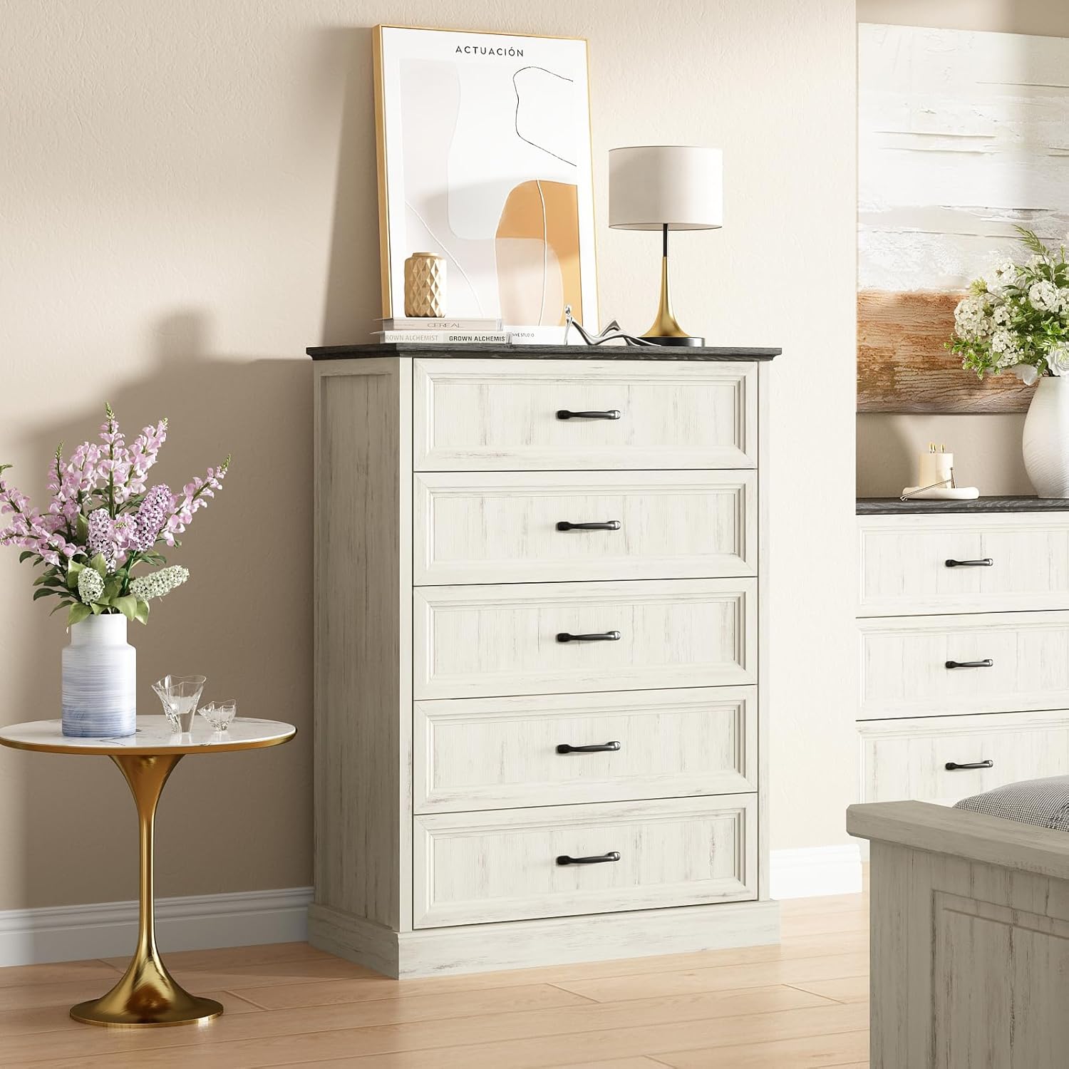 • Versatile, Stylish Dresser: Measuring 31.5"W × 15.7"D × 44.1"H, this versatile tall farmhouse dresser for bedoom offers an array of possibilities for your home organization. It features 5 smooth-glide drawers, each measuring 27.9"W × 11.3"D × 5.7"H, offering efficient storage solutions. Keep your space clean and organized by conveniently stowing clothing, socks, bedding, cosmetics, jewelry, and more. The natural-textured tabletop gives you more space to display your cherished photos, artworks, and decorations, turning your room into a captivating gallery.