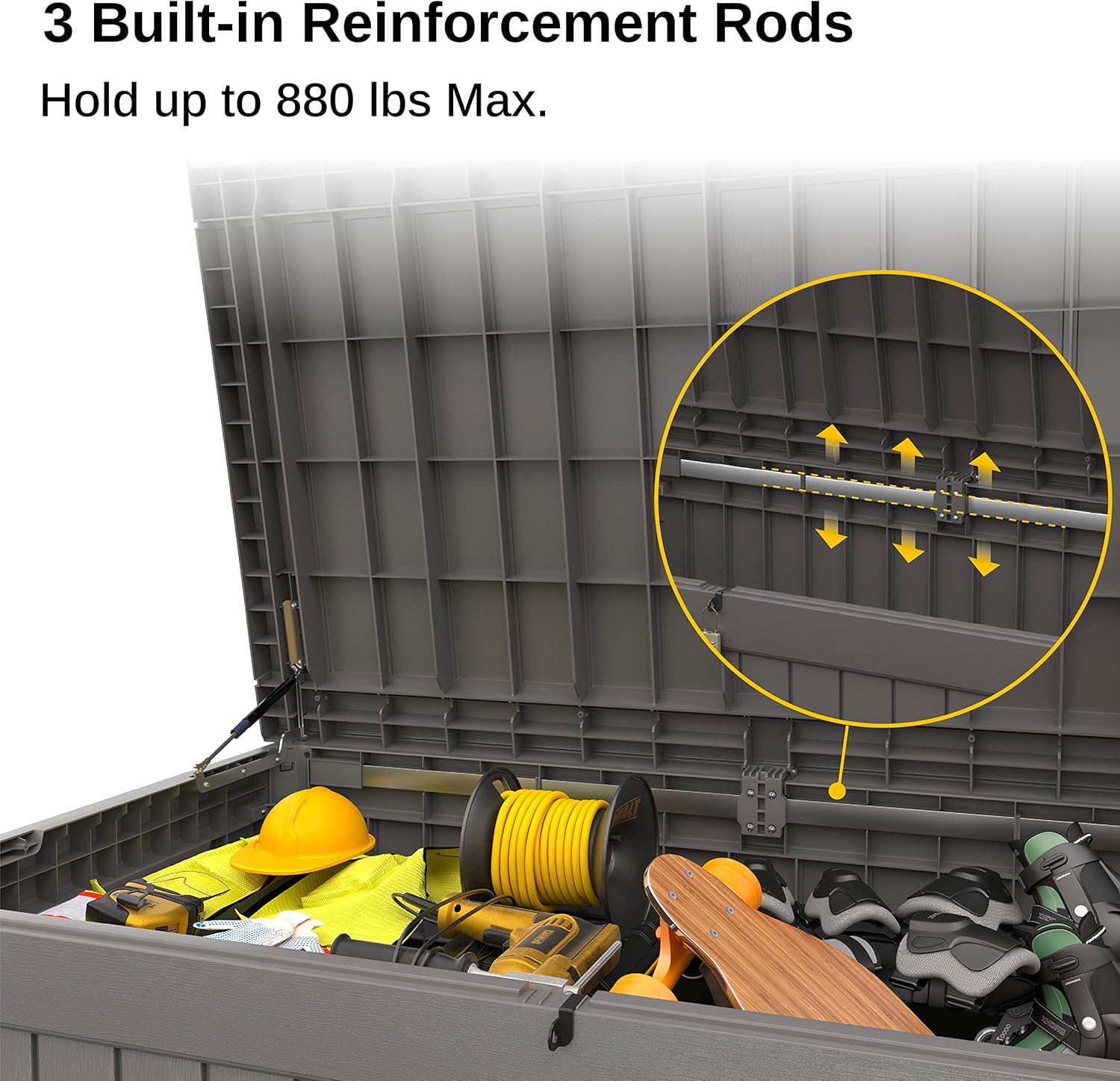 • ๐—ฆ๐—ง๐—ฅ๐—ข๐—ก๐—š ๐—”๐—ก๐—— ๐—ฉ๐—˜๐—ฅ๐—ฆ๐—”๐—ง๐—œ๐—Ÿ๐—˜: The EAST OAK 230-gallon deck box is reinforced with three built-in rods, supporting up to 880 pounds. This makes it perfect for outdoor storage and doubles as a sturdy patio table.