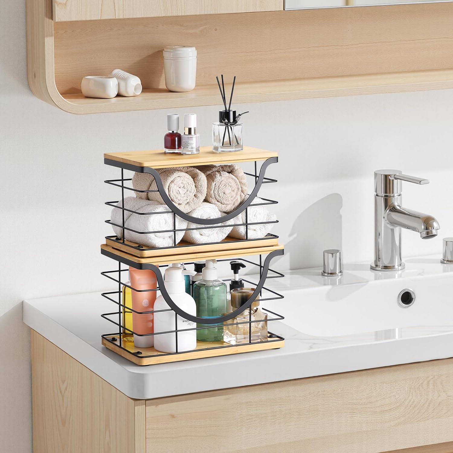 • 2 Ways to Use -stackable wire basket with bamboo top can be used on a tabletop or self-adhesive wall mounted. No need to drill holes, won't damage the wall. Multi-functional Garbage Bag Storage Dispenser is suitable for kitchen, laundry room, toilet, under the sink, cabinet, etc., you can store laundry supplies, cleaning supplies, vegetables and fruits, snacks and so on