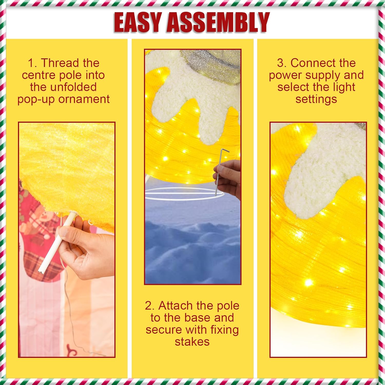 • Easy Setup: With collapsible frames, these ornaments are simple to assemble and disassemble, making them a convenient choice for your festive decor