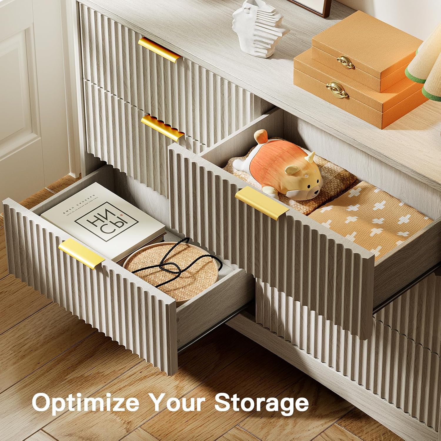 • 【Large Storage Capacity】The fluted dresser is equipped with 6 spacious drawers, capable of accommodating over 80 garments, 30 toys, 60 tissues, 80 skirts, 70 hats, and 130 pairs of socks. This generous storage space allows for the organized arrangement of clothing, bedding, cosmetics, or jewelry, thereby assisting you in maintaining a clean and orderly environment.