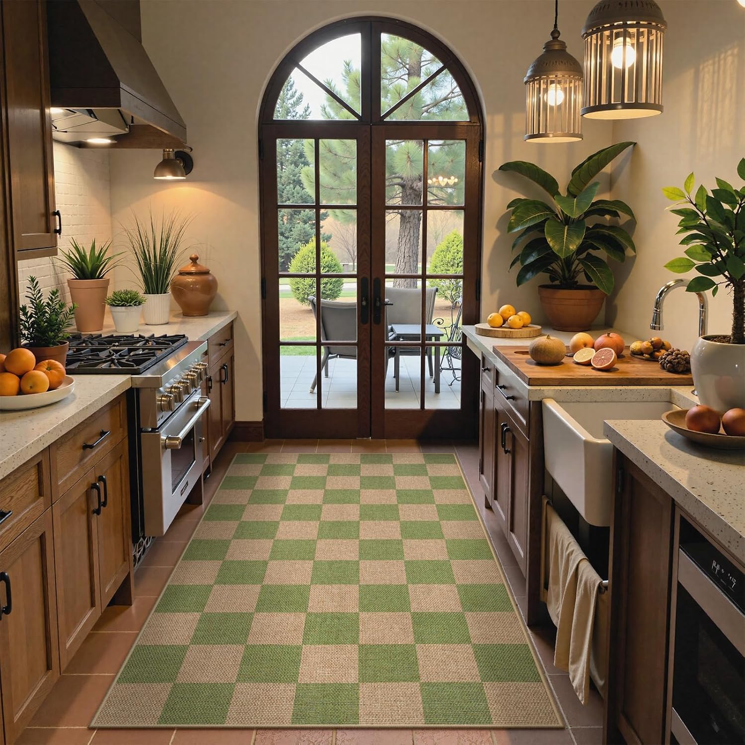 Lahome Checkered 3x5 Washable Rug, Green Easy Jute Rug for Entryway Living Room, Modern Non Slip Non Shedding Indoor Outdoor Carpet for Porch Deck Kitchen