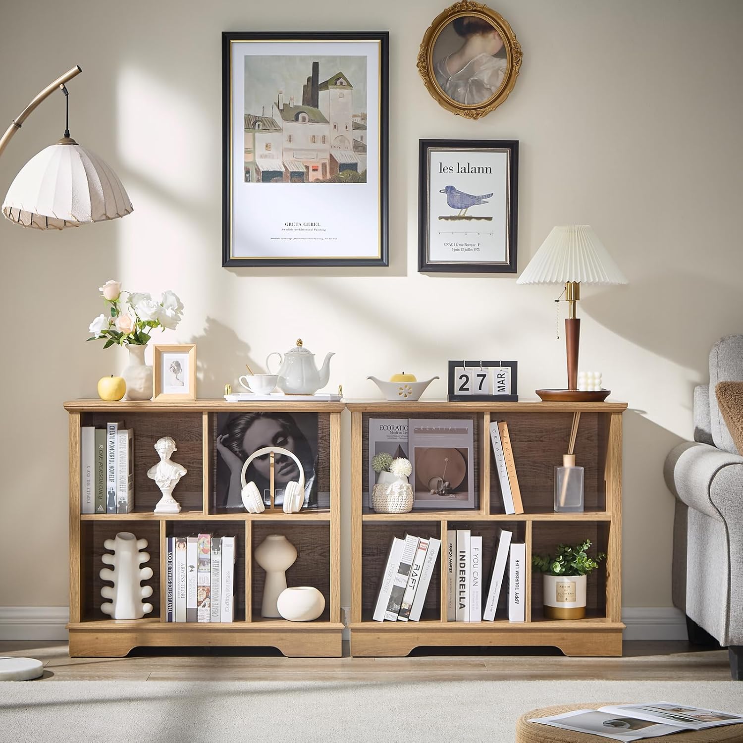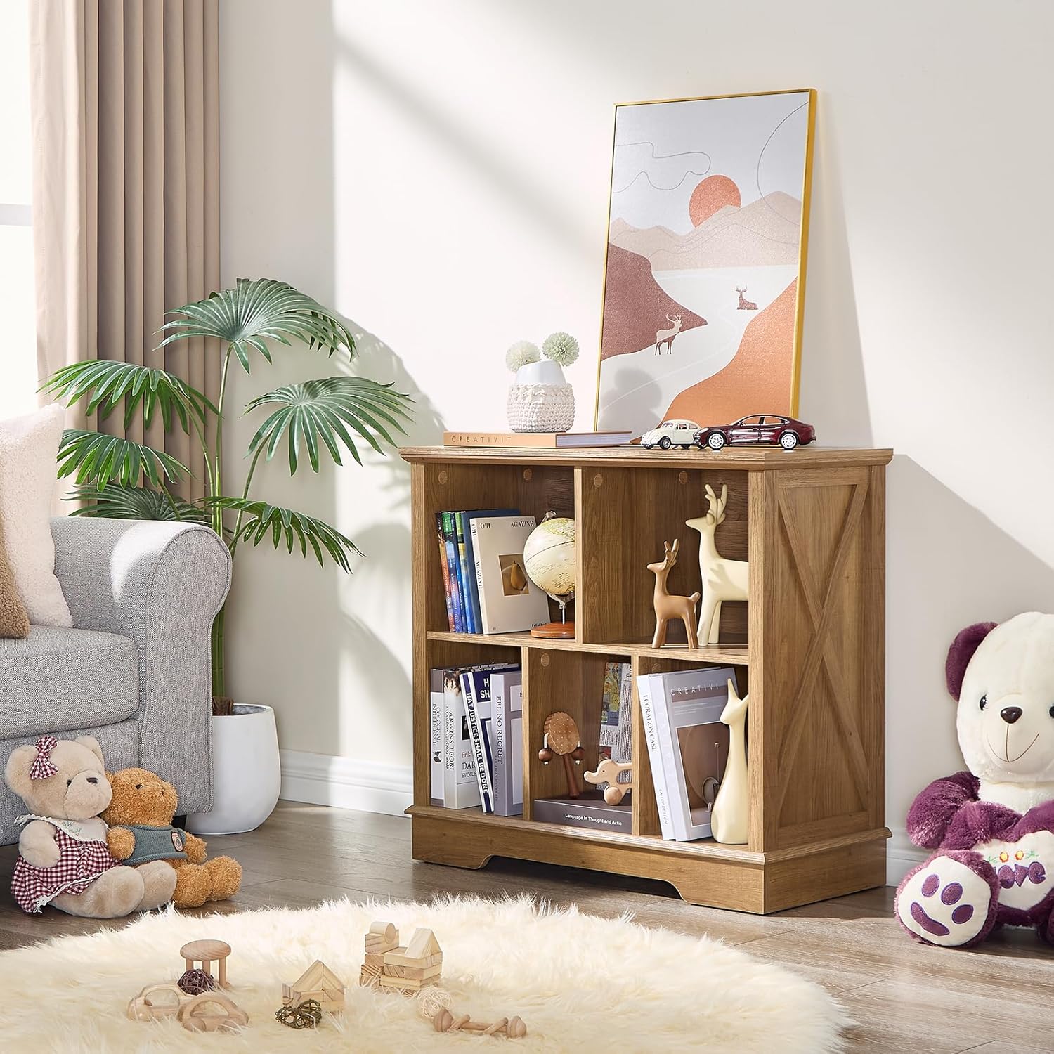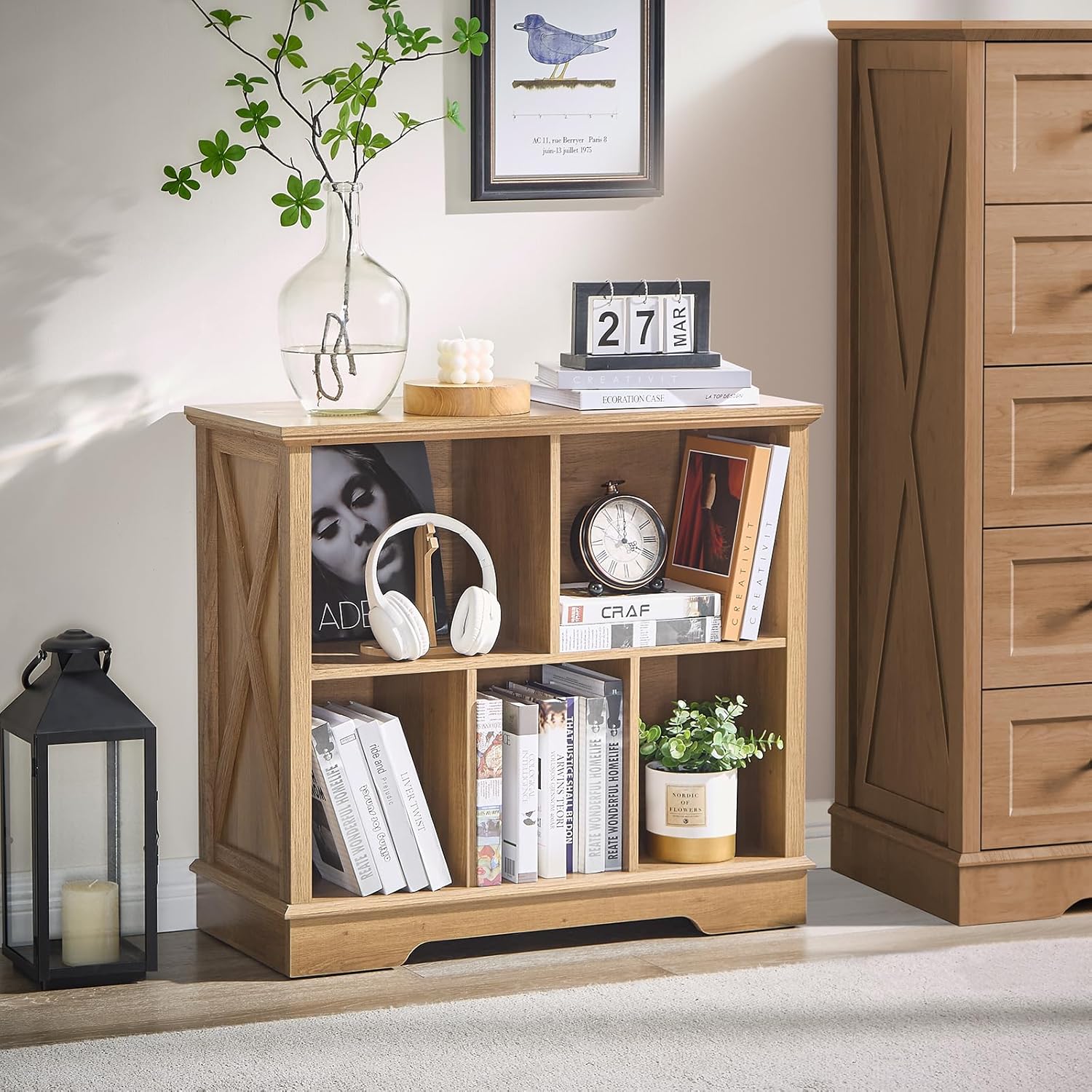 • 5 Cube Storage Space: Our farmhouse-style cube storage bookcase features six spacious compartments, perfect for organizing books, decor, baskets, and more. The rustic X-pattern side panels add a charming touch, seamlessly blending with our existing furniture collection to create a cohesive home decor set. Ideal for living rooms, bedrooms, offices, or closets, this bookcase combines functionality with timeless design