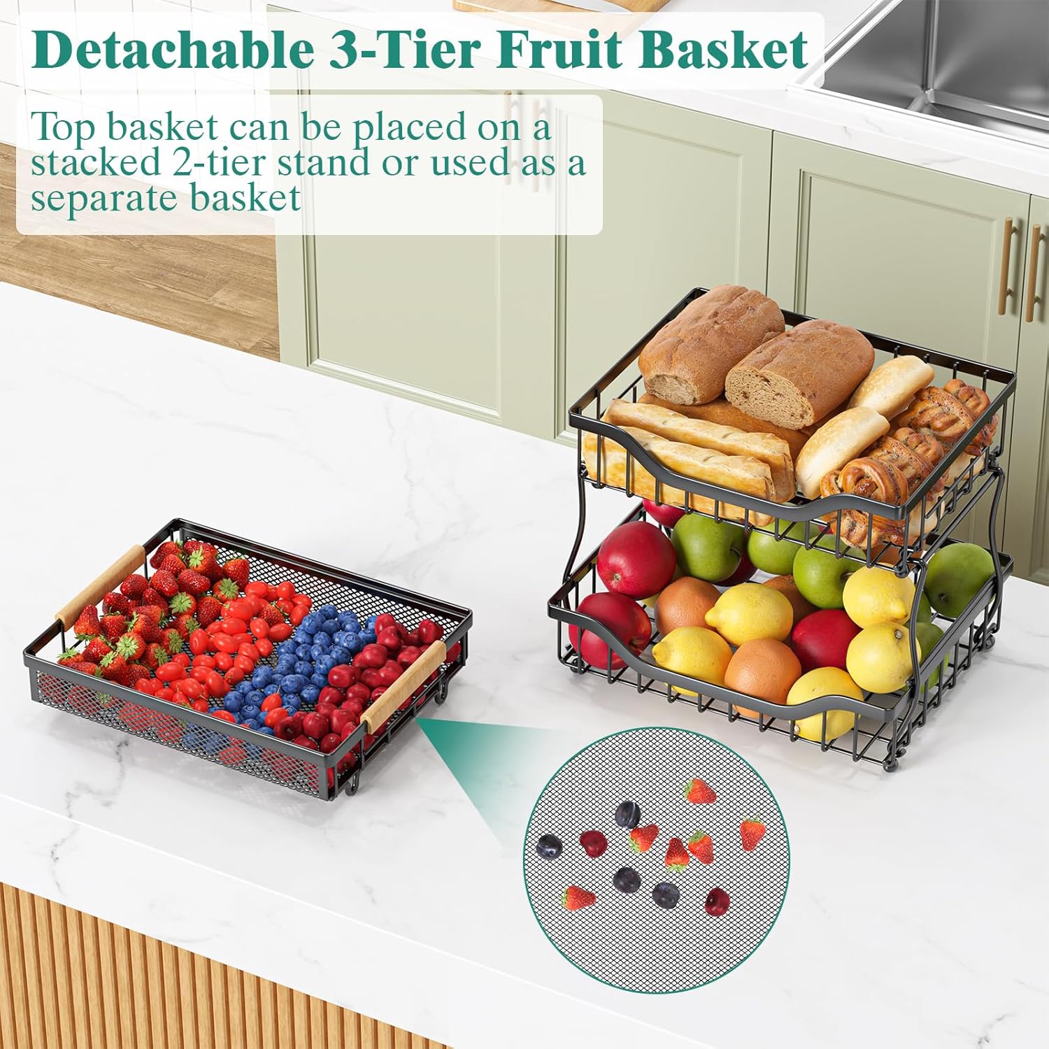 • Large Capacity: Our three tier large fruit basket is designed to efficiently organize a variety of fruits such as apples, oranges, bananas, tomatoes, and more. Sized at 9.4"D x 13.7"W x 17.3"H, ensuring ample space to keep your countertop neat and tidy