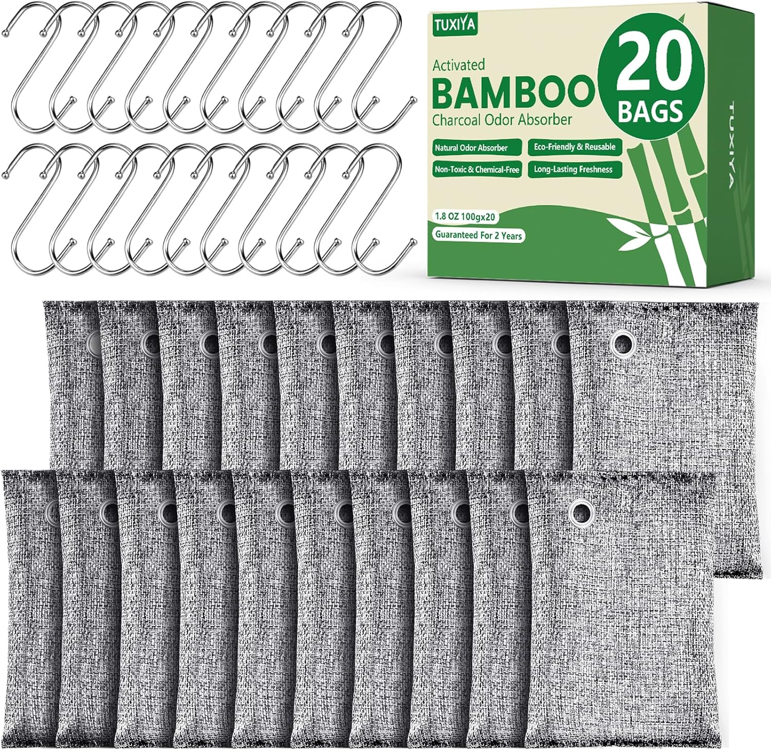 • 【Activated Charcoal】:This set includes 20 charcoal deodorizer bags (100g each) with hooks, designed to naturally absorb odors and moisture for a fresher environment.