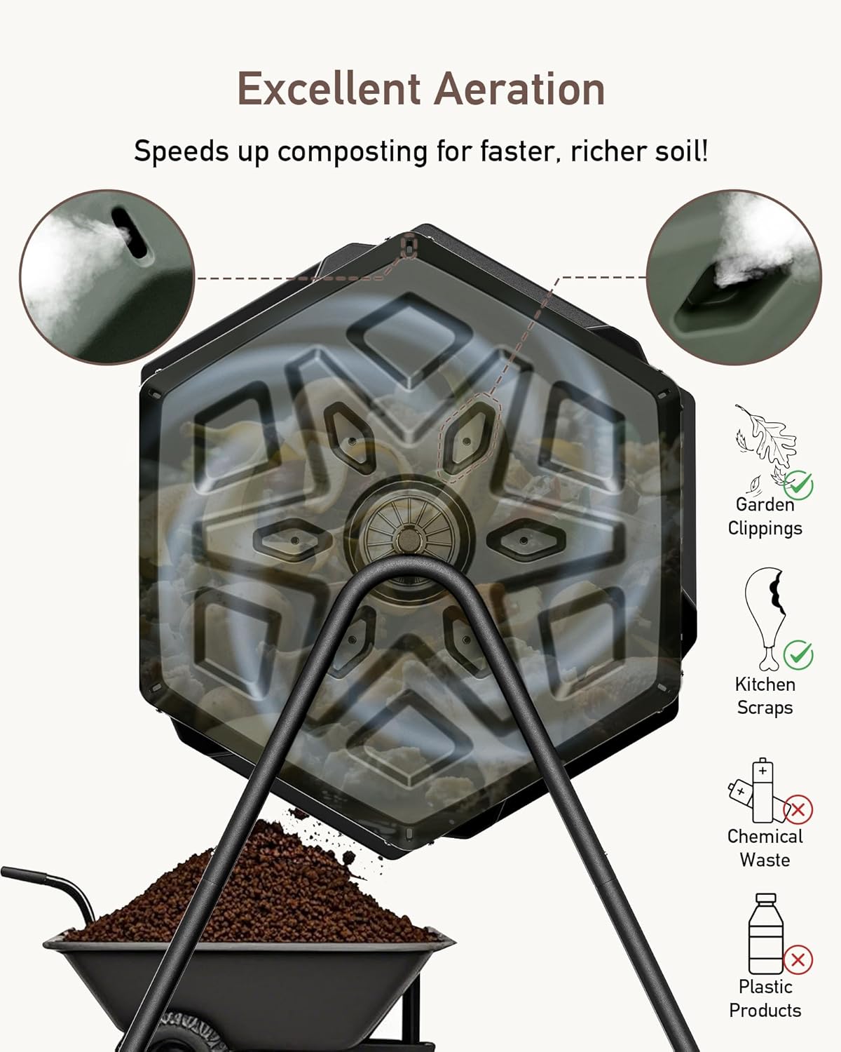 • Built to Last – Heavy-Duty & Weatherproof: Crafted from BPA-free PP plastic and a sturdy powder-coated steel frame, our outdoor composting bin is made to withstand rain, wind, and heat. Even during storms, it stays upright and stable. Ideal for anyone needing a compost bin outdoor, garden composter, or composters bins outdoor that won’t crack or rust. This is the dependable outdoor composter you've been looking for.
