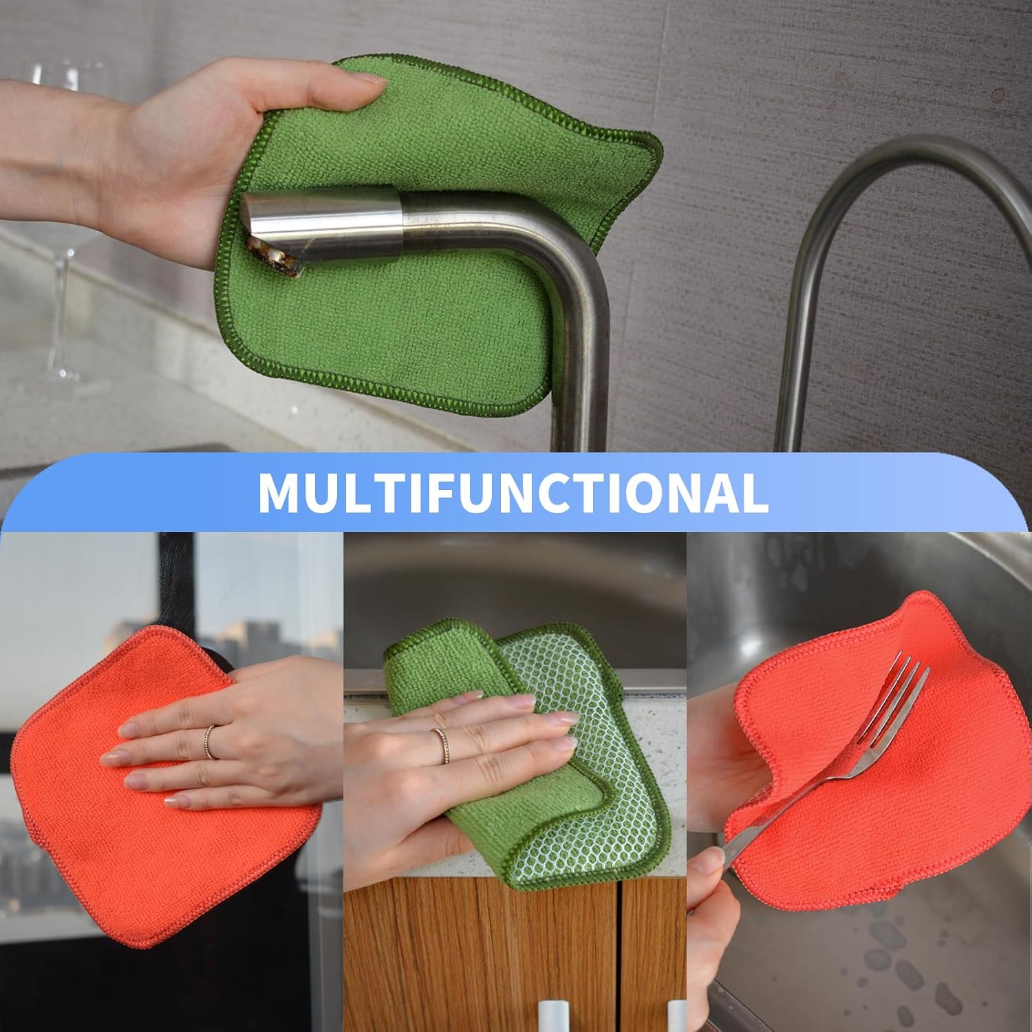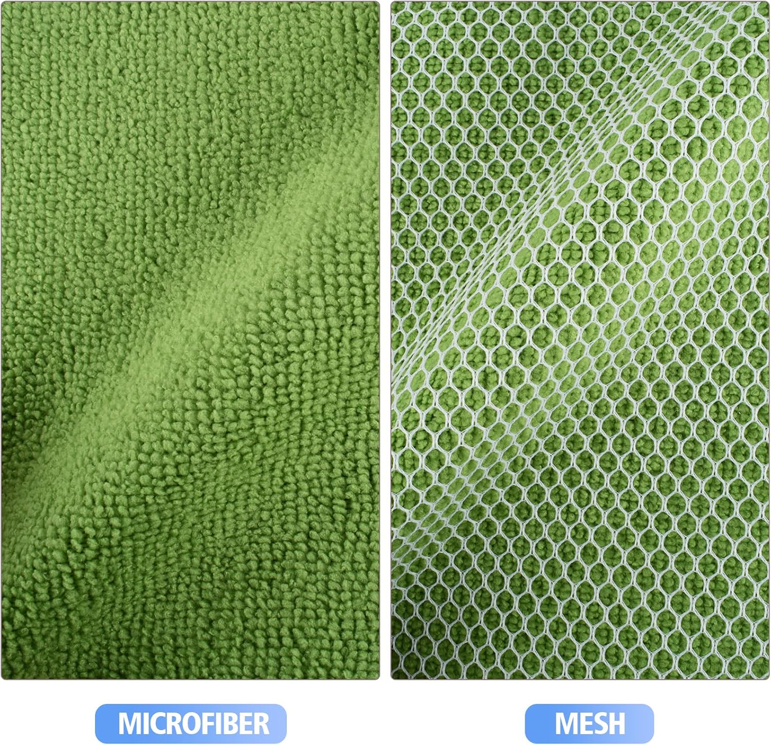 • DISH RAGS FOR KITCHEN CLEANING WITH POLY SCOUR SCRUBBING SIDE: One side is microfiber and the other side is mesh. The microfiber side works well at getting finger spots off the stainless steel appliances and the glass front of fridge or stove, microwave; the scrubby side is good for cleaning stuck on food without having to grab your scraper and does not scratch delicate surfaces either