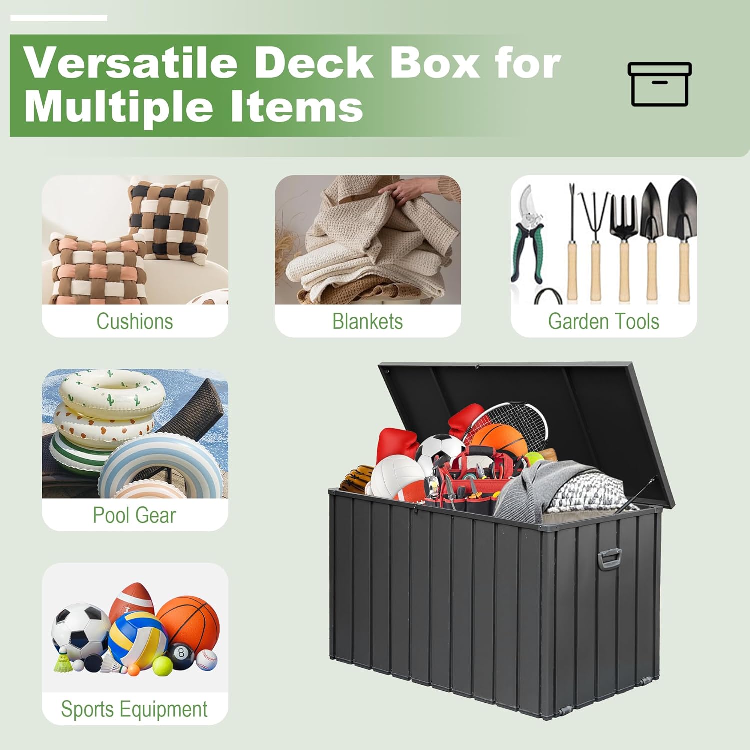 • Galvanized Steel Frame: Domi deck box is made of durable galvanized steel, offering waterproof and fade-resistant properties, while also effectively preventing damage from rodents and other animals.